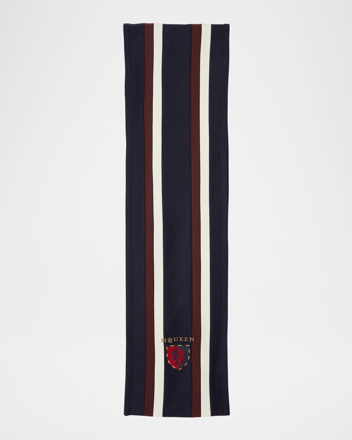 - McQueen striped scarf with collegiate crest motif - Can be styled multiple ways - Wool - Made in Italy
