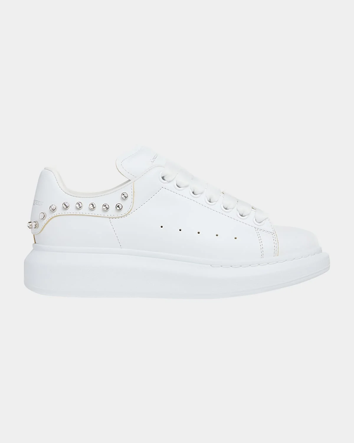 McQueen lowtop leather sneakers with a studded heel counter 1.50 in / 40 mm flatform heel Round toe Perforated sides Large flat laces Laceup vamp Rubber outsole Lining: Unlined Made in Italy