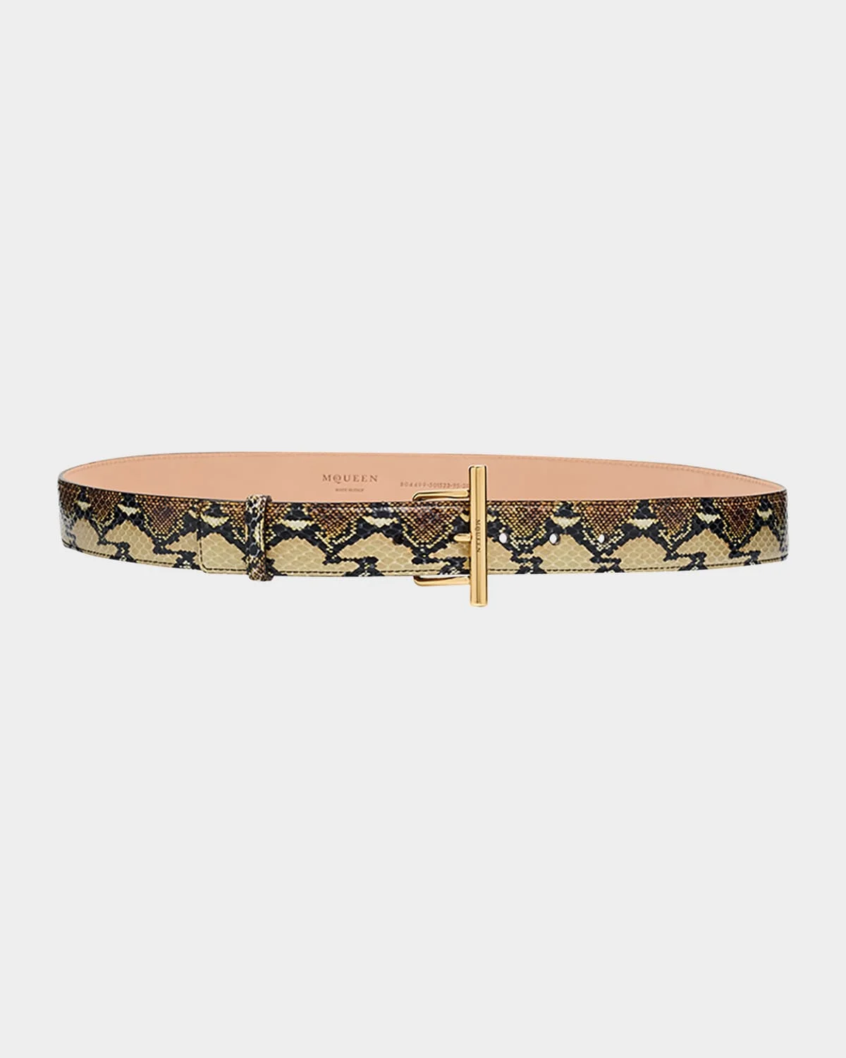 - McQueen snakeskin printed calfskin leather belt with logo-engraved T-bar buckle - Goldtone hardware - Topstitching - Skinny width - Adjustable fit - Leather - Made in Italy