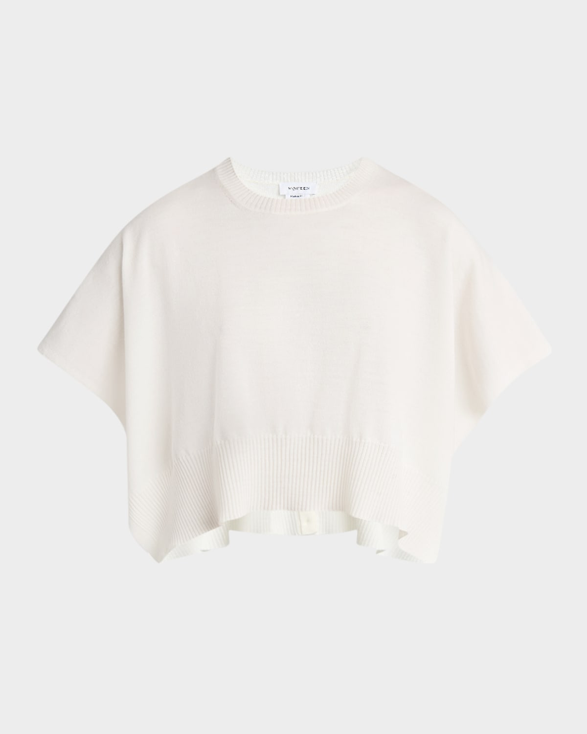 - McQueen "Volume" knit top finished with mother-of-pearl buttons along the back for versatile styling - Crew neckline - Short sleeves - Mini side slits - Relaxed fit - Cropped length - Pullover style - Wool/mother-of-pearl/viscose - Made in Italy