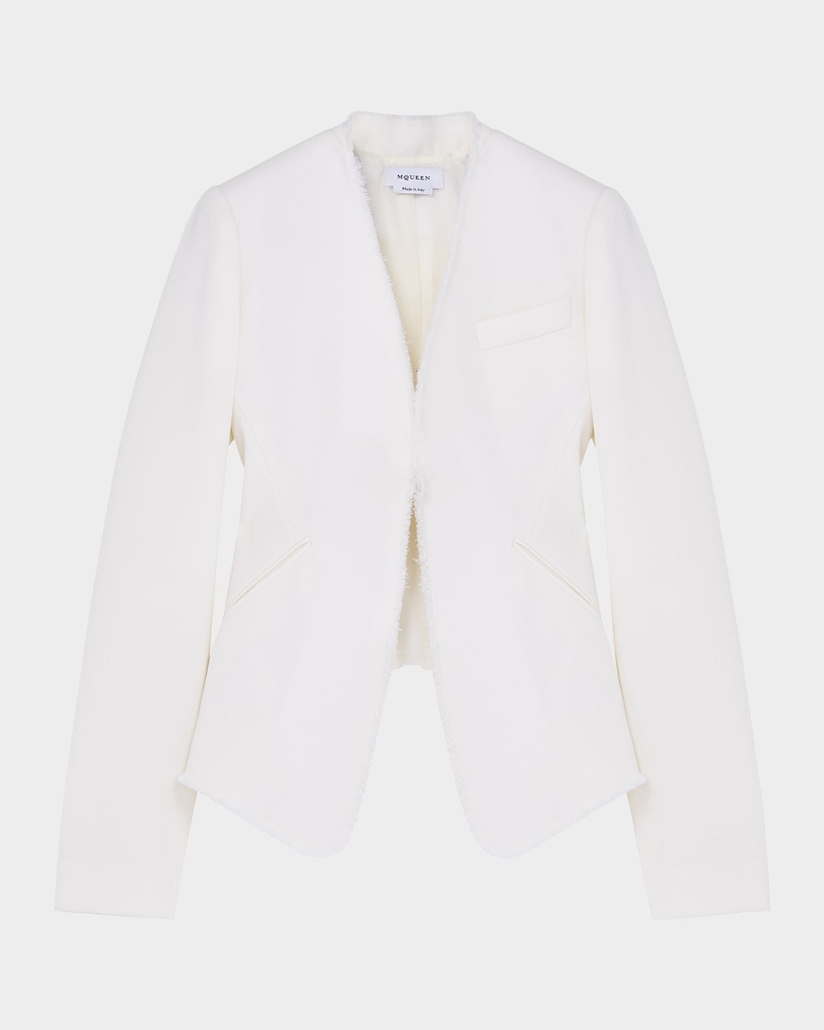- McQueen wool canvas blazer complete with a flirty peplum hem and fringe trim detailing - V neckline; single-breasted front - Strong shoulders - Long sleeves; button cuffs - Chest welt pocket - Slanted side besom pockets - Slim fit - Longline silhouette - Wool/cupro - Made in Italy