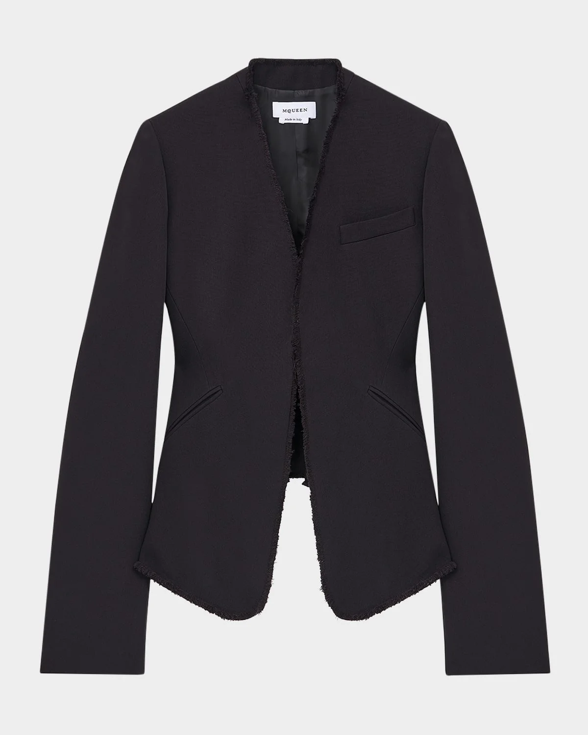 - McQueen wool canvas blazer complete with a flirty peplum hem and fringe trim detailing - V neckline; single-breasted front - Strong shoulders - Long sleeves; button cuffs - Chest welt pocket - Slanted side besom pockets - Slim fit - Longline silhouette - Wool/cupro - Made in Italy
