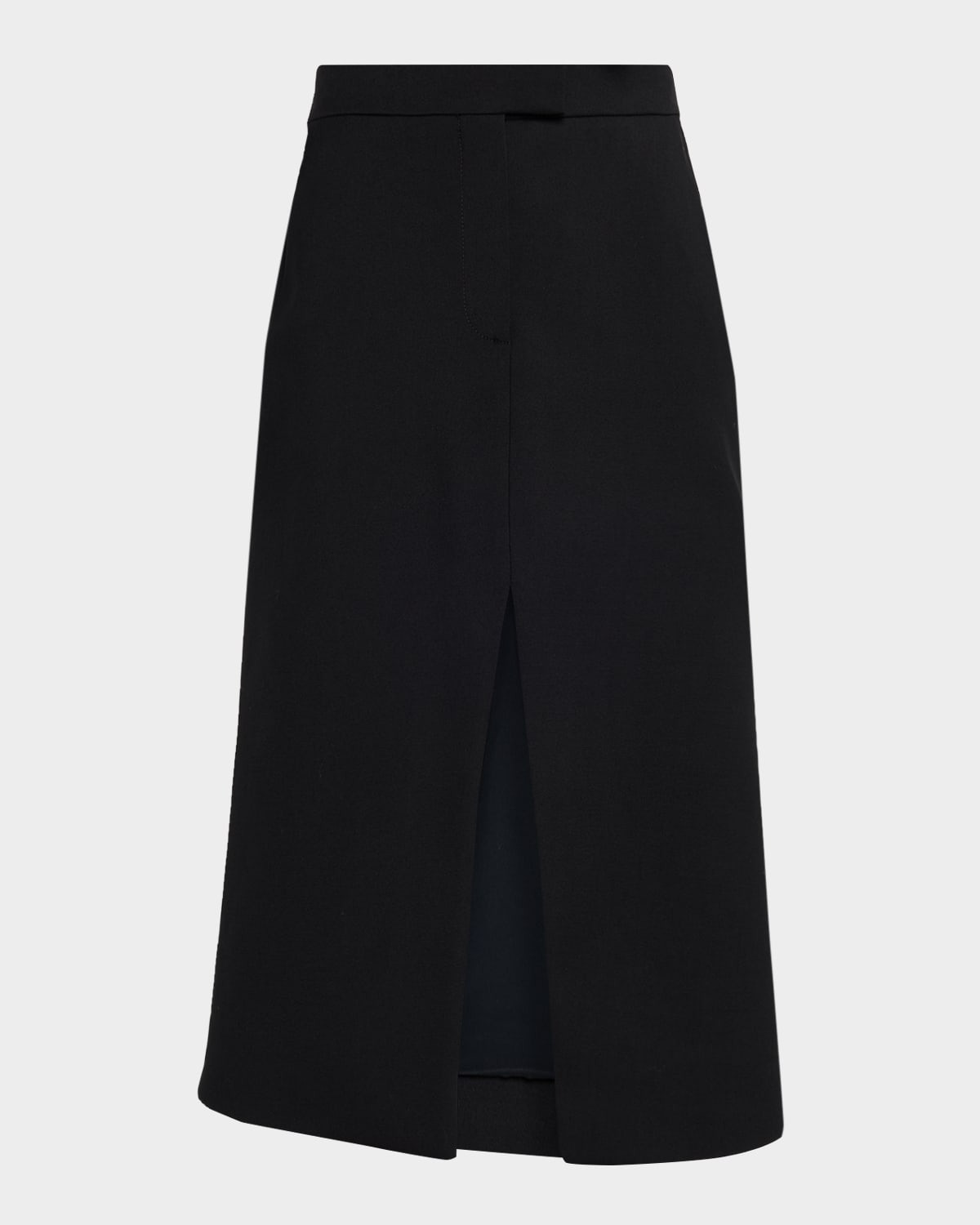 McQueen skirt is crafted of a wool stretch twill featuring a front slit High waist Angled side slip pockets Back buttonwelt pocket Aline silhouette Hem falls below the knee Hooktab/zip fly Wool/elastane/acetate Dry clean Made in Italy