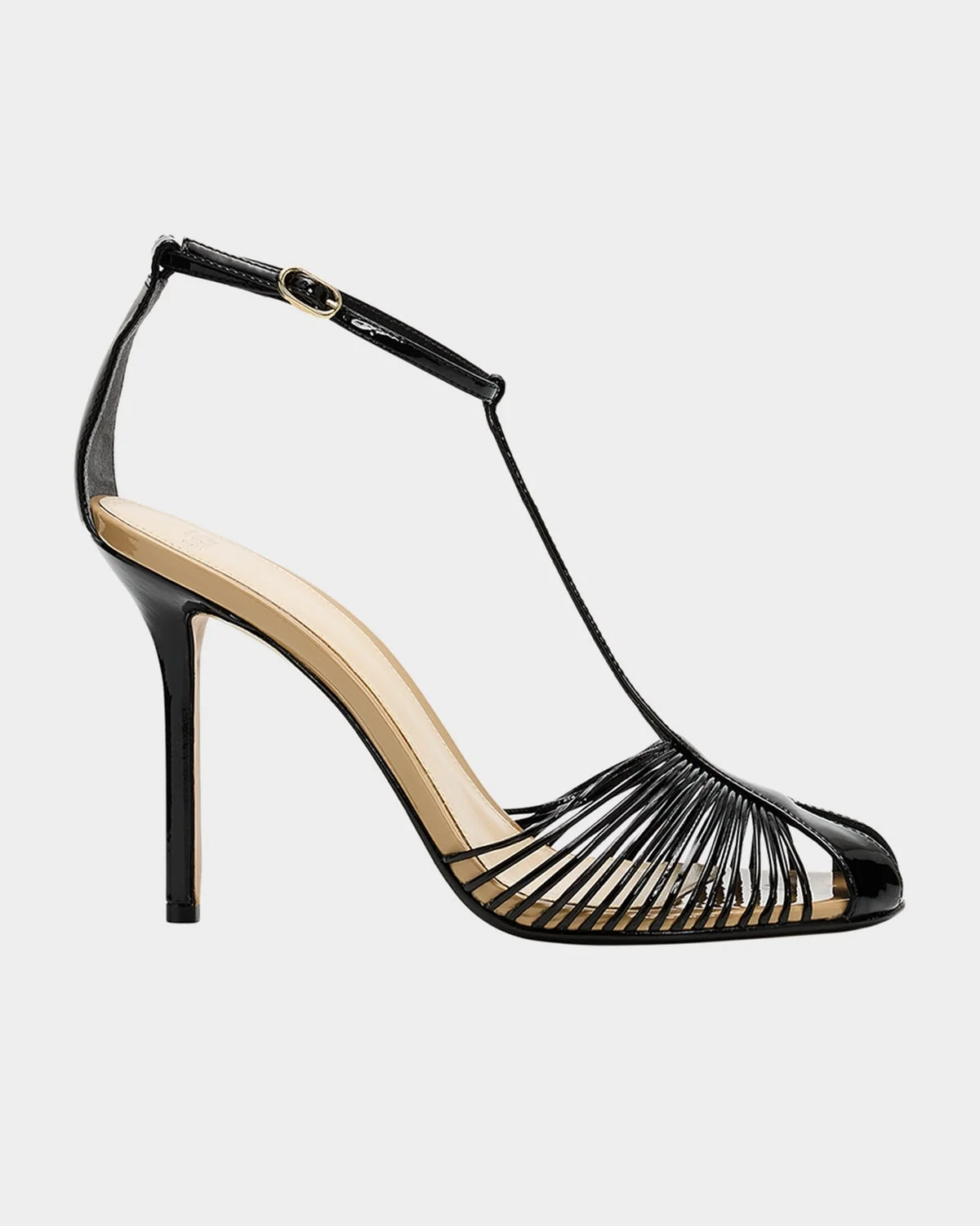 Alexandre Birman & apos;s "Serena" sandals are crafted from leather with a sweeping patent curved upper and refined tubular strap detailing 4.00 in / 100 mm stiletto heel Rounded peep toe T-strap vamp Adjustable ankle strap Made in Brazil