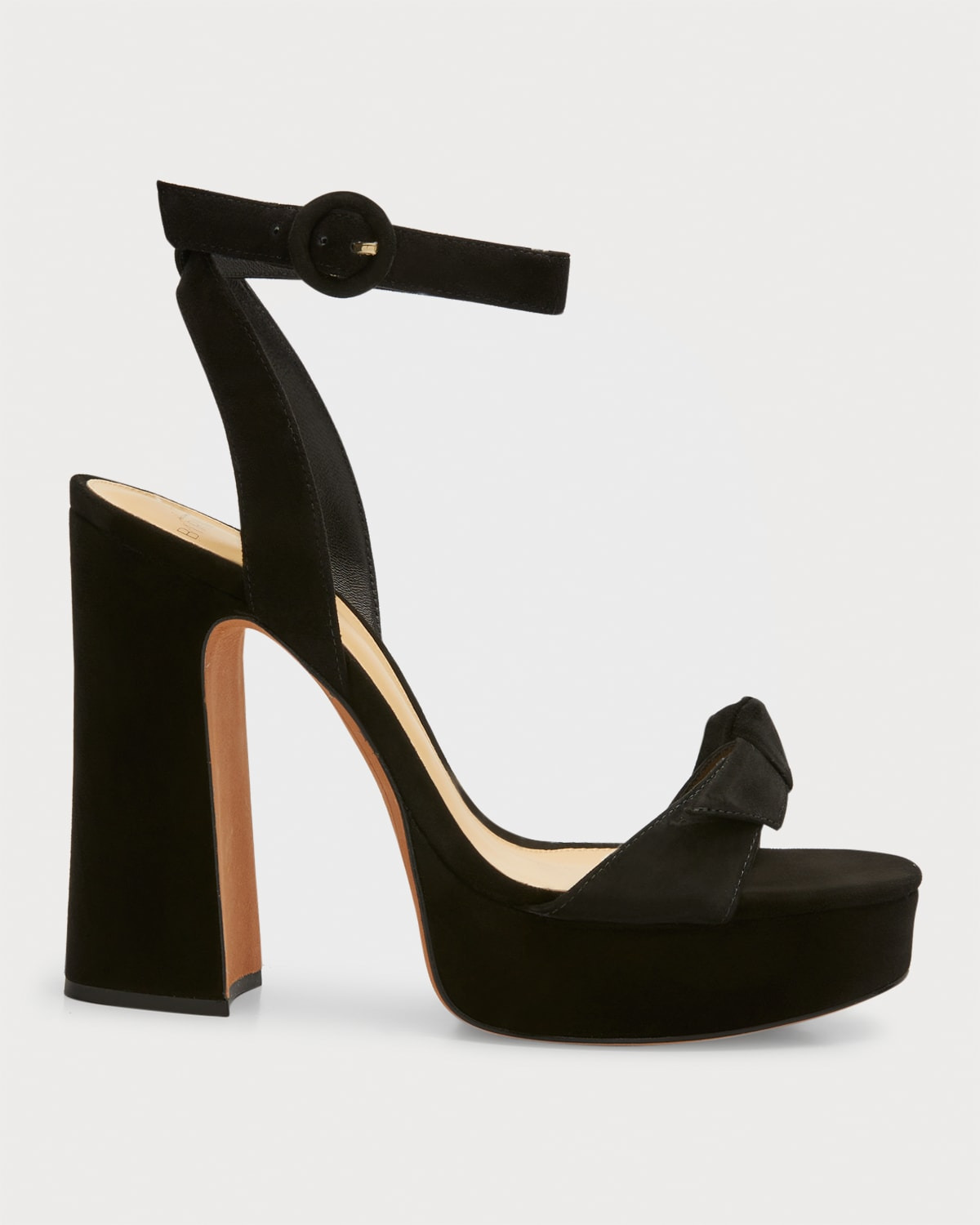 - Alexandre Birman "Clarita" platform sandals in soft suede. - 4.8" covered block heel. - Knotted strap bands open toe. - Adjustable ankle buckle. - Leather lining and sole. - Made in Brazil.