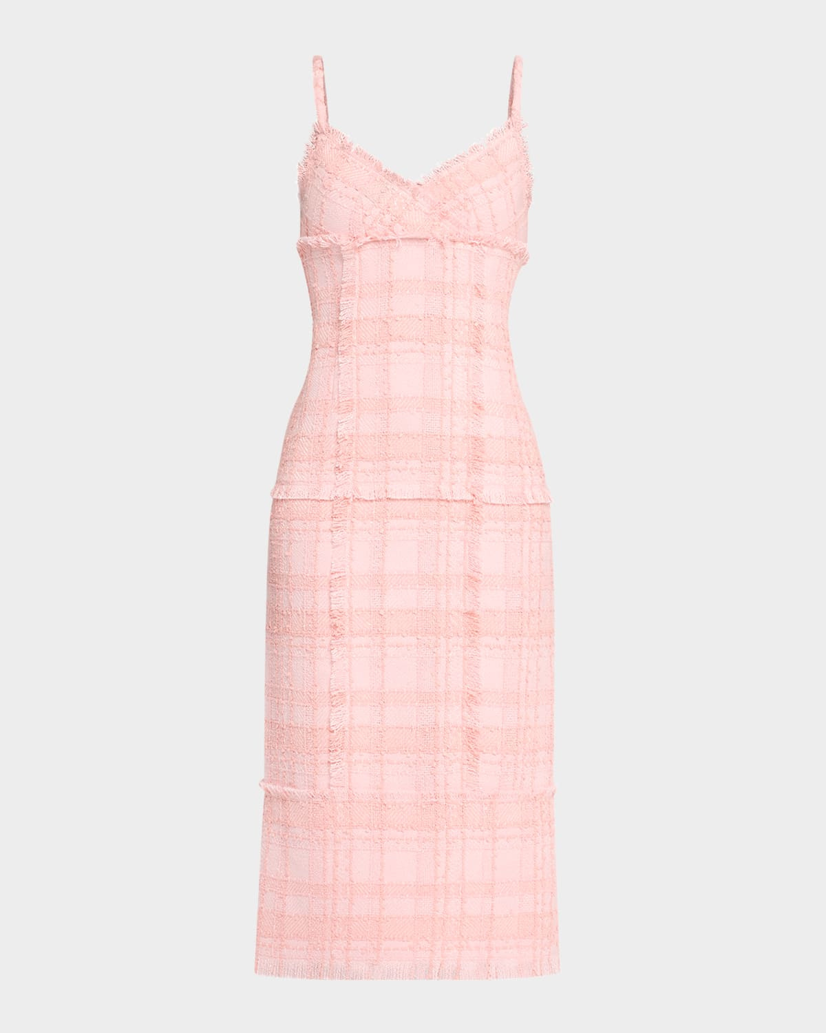- Alexis "Vicci" refined midi dress crafted in textured tweed with fringe detailing - Sweetheart neckline - Sleeveless - Center-cut back vent - Hem falls below the knee - A-line silhouette - Invisible back zipper - Polyester/polyester/elastane - Lining: Elastane/polyester - Dry clean - Imported