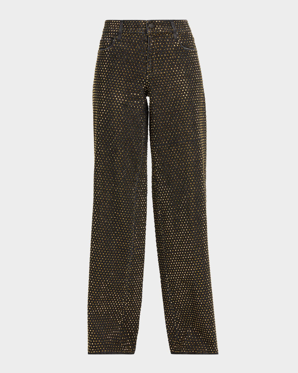 Crafted from heavyweight, nonstretch black denim, the "Amazing" jeans by Alice + Olivia are embellished with allover goldtone studs Approx. 9.3" rise; 34.3" inseam Midrise sits high on hip Fivepocket style Full length Wide legs Button/zip fly; belt loops Cotton/elastane Lining: Cotton Dry clean Imported