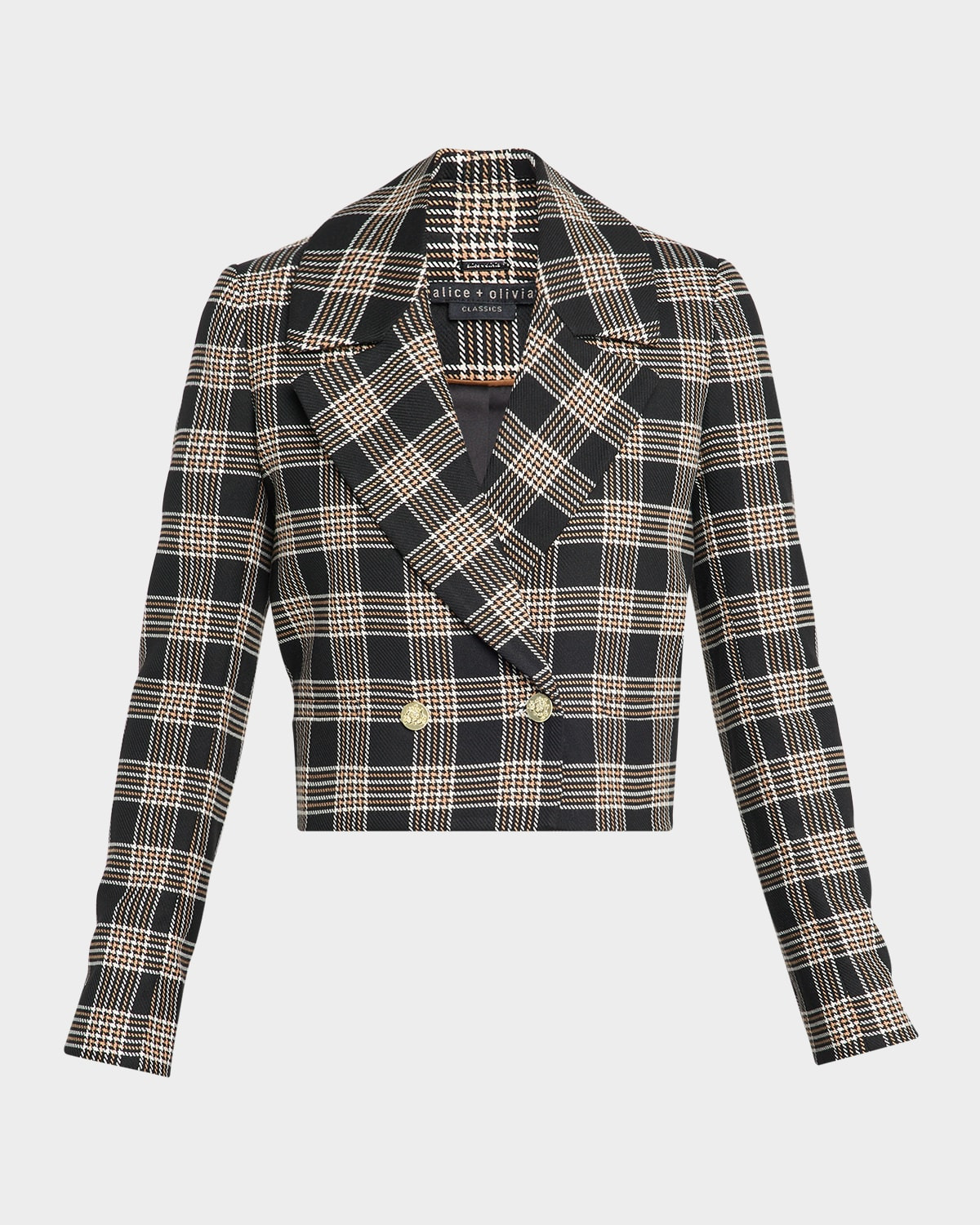 Designed in stretch viscose for a comfortable fit, the "Avery" blazer by Alice + Olivia is printed with collegiateinspired plaid for a classic design Approx. 19.5"L from shoulder to hem Notched collar; doublebreasted front Strong shoulders Long sleeves with button cuffs; approx. 32"L Relaxed fit Cropped hem Polyester/viscose/elastane Lining: Recycled polyester Dry clean Imported