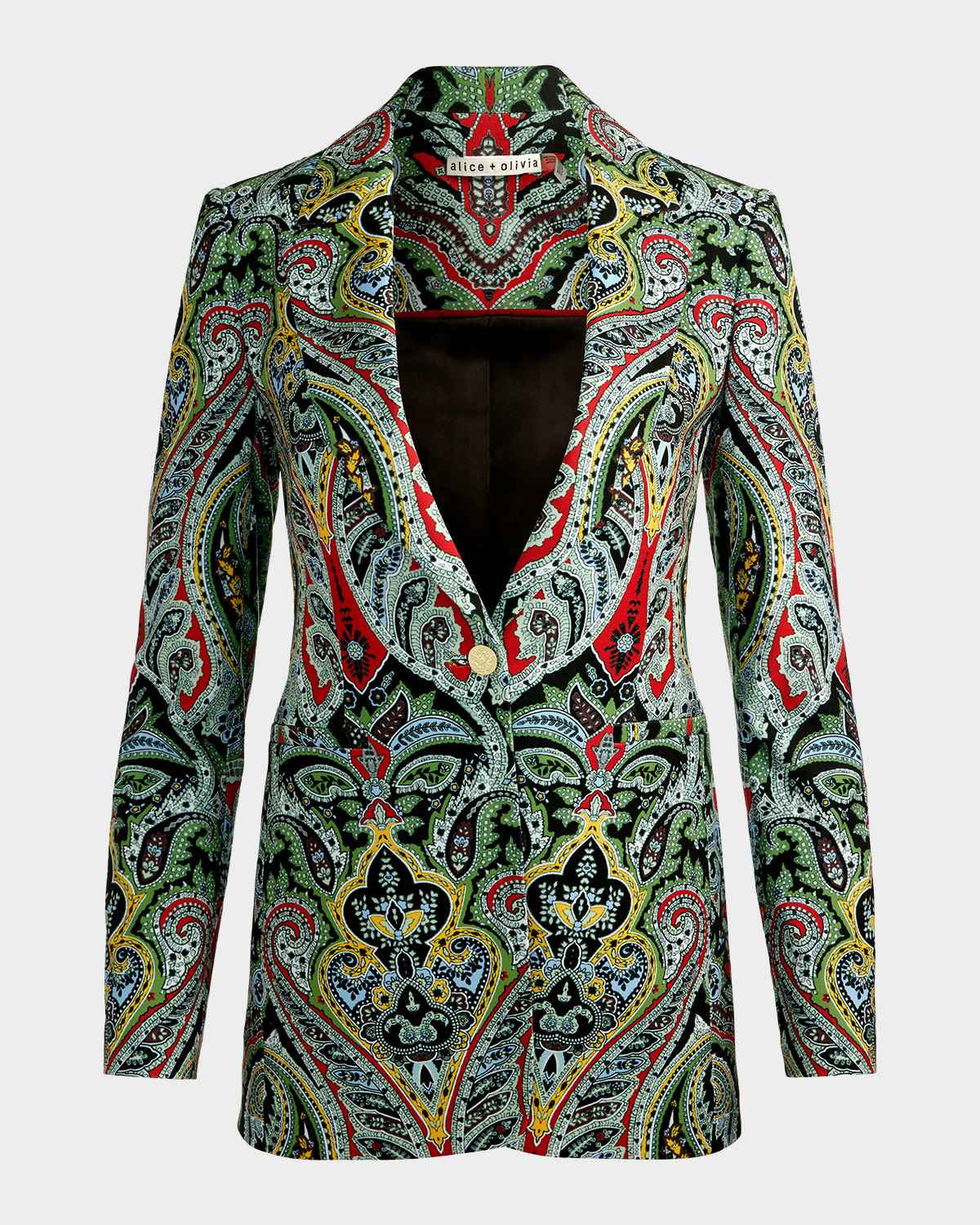 - Showcased in a bold paisley pattern on matte satin crepe, the Breann blazer by Alice + Olivia is framed with strong shoulders for a statement-making look - Approx. 28.5"L from shoulder to hem - Notched collar; single-button front - Long sleeves; button cuffs - Hip welt pockets - Fitted - Longline silhouette - Polyester - Lining: Recycled polyester - Dry clean - Imported