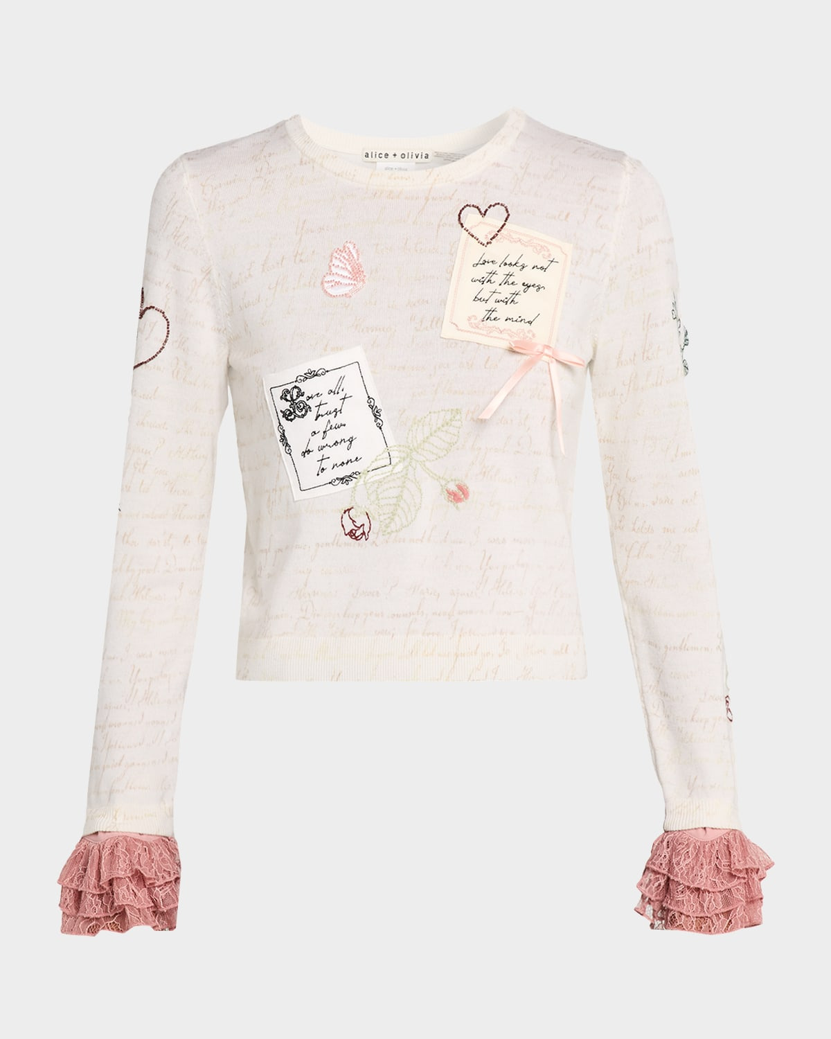 Alice + Olivia "Carolann" sweater is crafted of ribbed knit featuring script print, love note embroidery, and tiered lace ruffle cuffs Approx. 19.5"L from shoulder to hem Crew neckline Long sleeves; approx. 31.5"L Slim fit Hip length Pullover style Wool/elastane Unlined Dry clean Imported