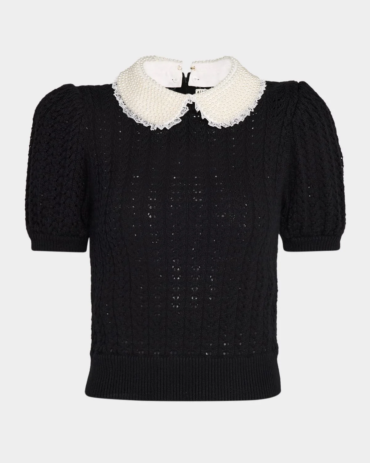 Knit in a textural openwork construction, the "Chase" sweater by Alice + Olivia is elevated with a contrasting faux pearlembellished collar Approx. 20"L from shoulder to hem Lacetrim Peter Pan collar Short puff sleeves; approx. 16.5"L Slim fit Hip length Ribbed cuffs and hem Center back zipper Wool/nylon/polyamide Lining: Nylon Dry clean Imported