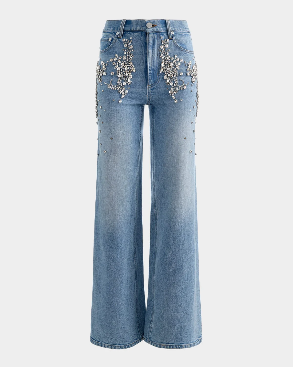 Embellished with chunky mixed-cut crystals, ALICE + OLIVIA & apos;s "Chic" jeans are cut from light-wash denim with a hint of stretch Approx. 34.5" inseam High rise Five-pocket style Full length Wide legs Button/zipper fly; belt loops Cotton/elastane Dry clean Imported & nbsp; SIZE & FITModel measurements: 5 & apos;10" tallModel is wearing a US size 4/Small