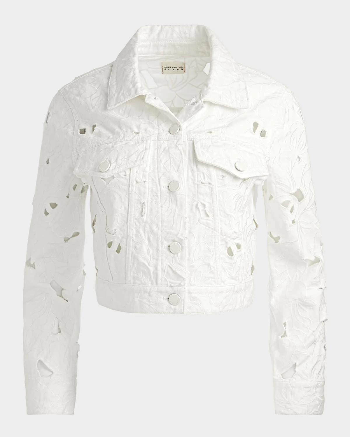 - Alice + Olivia "Chloe" white-wash denim trucker jacket in an openwork eyelet-embroidered construction - Spread collar - 3/4 sleeves; button cuffs - Buttoned chest flap pockets - Yoked back - Cropped hem - Button front closure - Cotton/rayon/cellulose acetate - Imported