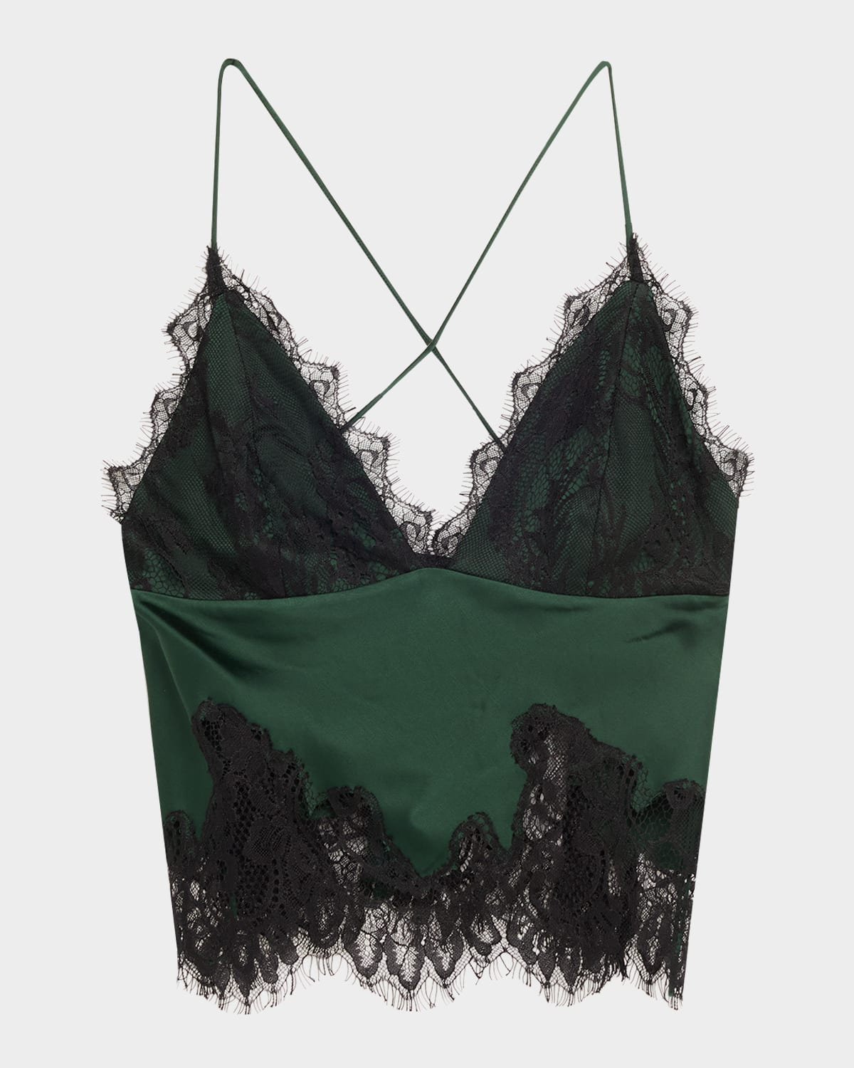 Delicate and feminine, the "Claudia" lingerinspired top by Alice + Olivia is crafted from lustrous satin with lace trim, ideal for layering or wearing on its own for a night out Approx. 22"L from shoulder to hem V neckline Sleeveless Open back with delicate crisscross straps Cropped hem Invisible back zipper Viscose/elastane Lining: Recycled polyester Imported