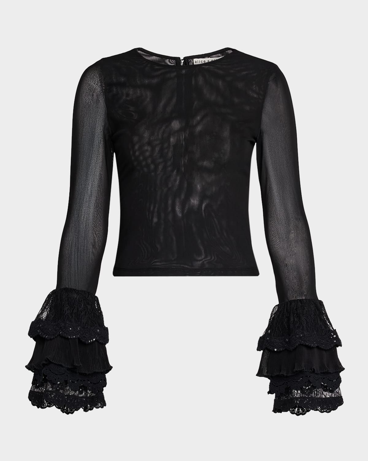 Designed in semisheer mesh, the "Delaina" top by Alice + Olivia features a lined bodice for added coverage and ruffled lace cuffs, adding a touch of romance to a classic layering piece Approx. 19.5"L from shoulder to hem Crew neckline Long sleeves; approx. 31.5"L Slim fit Hip length Center back zipper Polyester/elastane Unlined Dry clean Imported