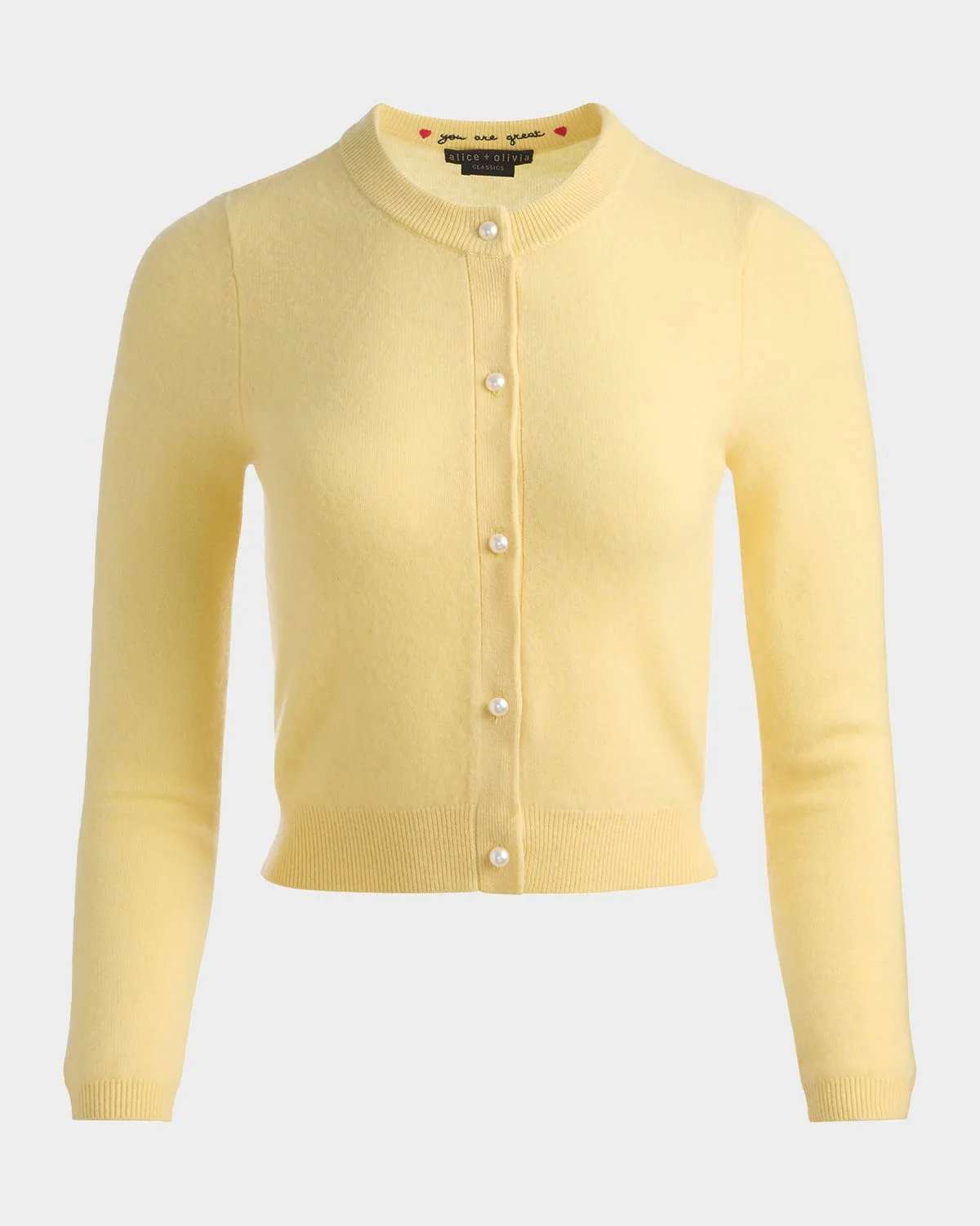 Knit from cozy cashmere, the "Dollie" cardigan by Alice + Olivia features a discreetly stitched message inside the neckline: "you are great" Approx. 18.5"L from shoulder to hem Crew neckline; pearly button front Long sleeves; approx. 31.5"L Slim fit Cropped length Ribbed cuffs and hem Cashmere Unlined Dry clean Imported