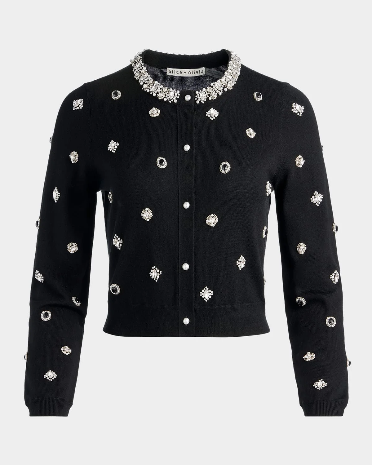 Knit from cozy wool with a hint of stretch, the "Dollie" cardigan by Alice + Olivia is embellished with faux pearl detailing for an effortlessly polished look Approx. 18.5"L from shoulder to hem Crew neckline Long sleeves Slim fit Cropped hem Button front closure Wool/elastane Unlined Imported