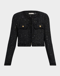 The "Dumont" jacket from Alice + Olivia is crafted in textured tweed with embellished sequins Approx. 17"L from shoulder to hem Collarless neckline Padded shoulders Long sleeves with button cuffs; approx. 31.5"L Cropped hem Boxy fit Front hook closures Polyester Lining: Recycled polyester Dry clean Imported
