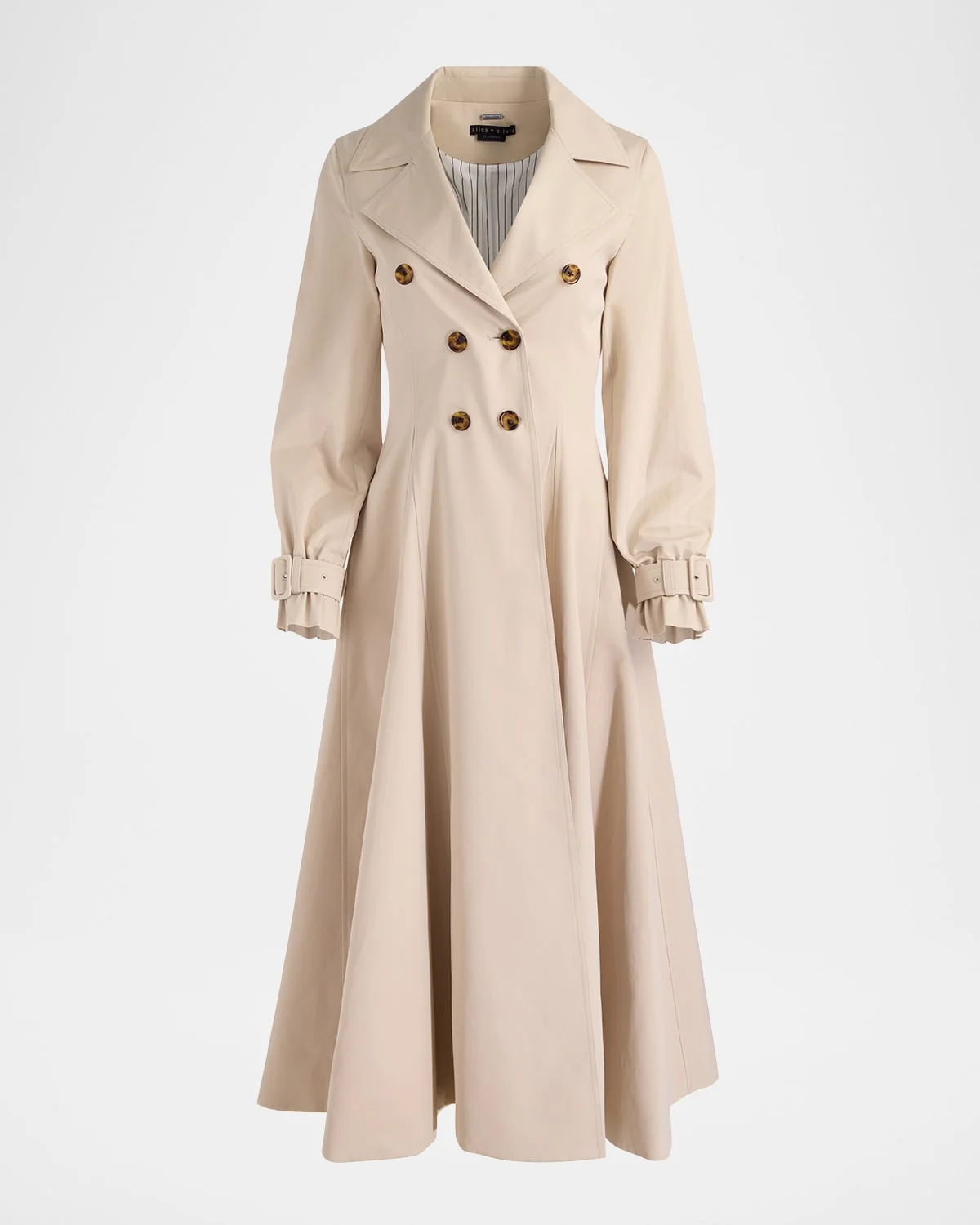 Cut from crisp cotton twill, Alice + Olivia's "Ellie" trench coat features a cinched waist and pleated godets for an added sense of movement with each step Designed to be worn open as a jacket or buttoned up as a dress Notched lapels; doublebreasted front Long sleeves; belted cuffs Back storm flap Adjustable back belt Hem falls below the knee Cotton Hand wash or dry clean Imported