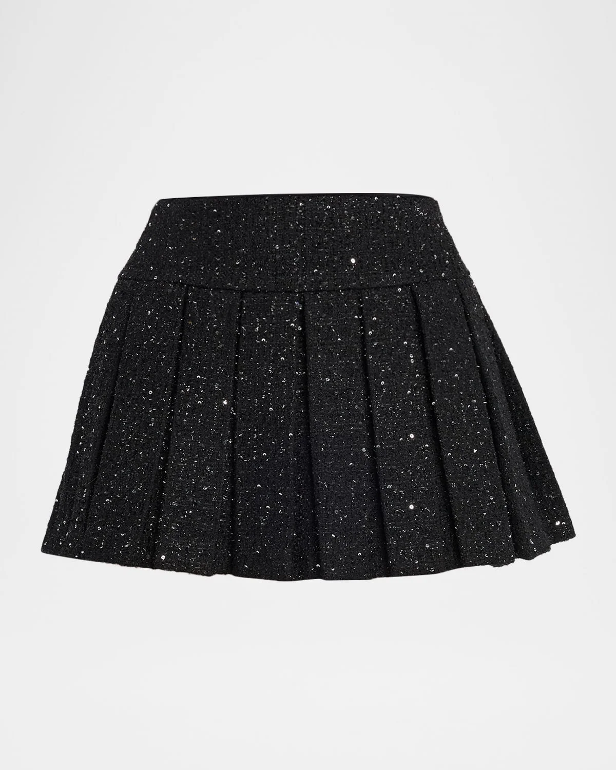 The "Emilie" pleated skort from Alice + Olivia is designed in tonal shine tweed and consists of a full skirt overlay with builtin shorts High waist Hem falls above the knee Aline silhouette Center back zipper Polyester Lining: Recycled polyester Dry clean Imported