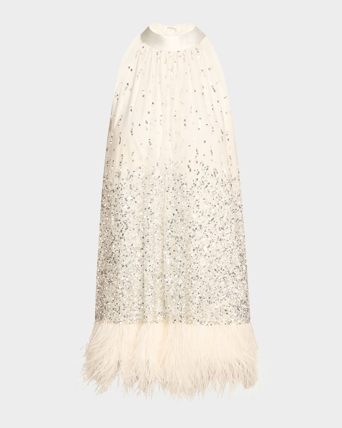- Alice + Olivia "Erna" sequin-embellished dress adorned with ostrich feather trim - Approx. 34"L from shoulder to hem - Halter neckline; self-ties behind the neck - Sleeveless - Hem falls above the knee - A-line silhouette - Feather/nylon/polyamide - Lining: Recycled polyester/elastane - Dry clean - Imported