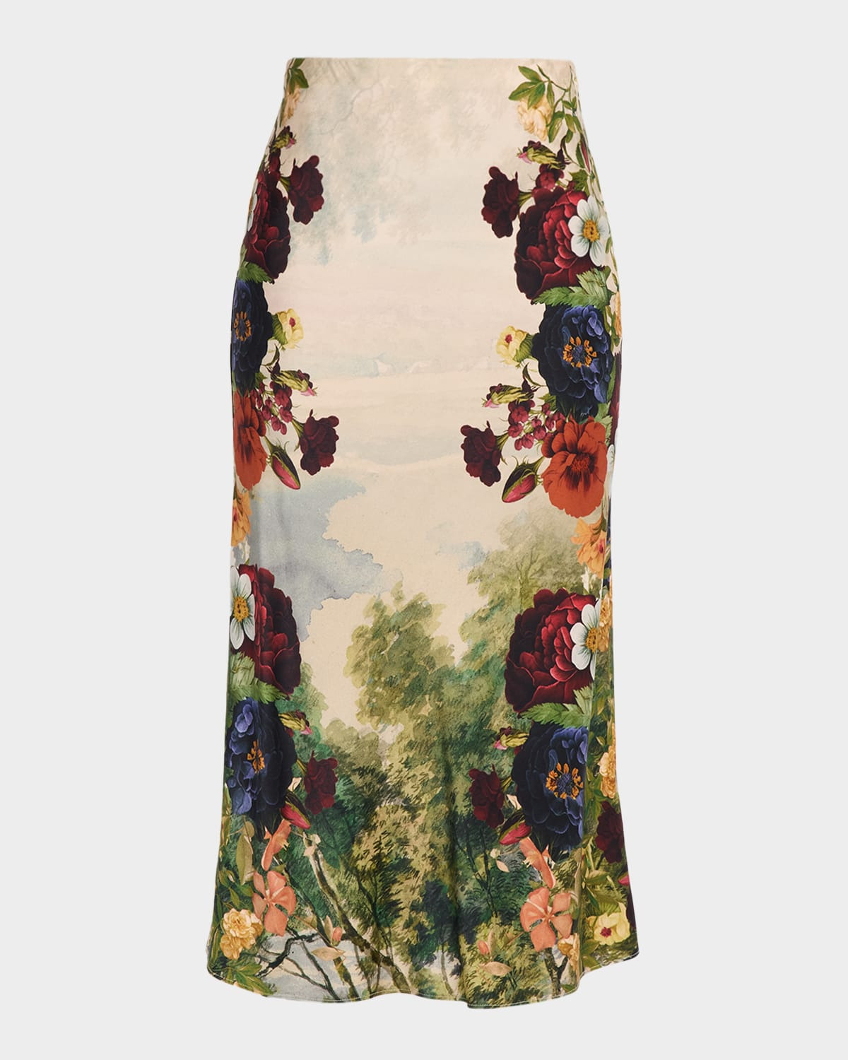 Illustrated with a vivid forest print, the "Maeve" slip skirt by Alice + Olivia is crafted from silky stretch viscose for a comfortable, fluid silhouette Highrise Centercut back slit; approx. 12"L Hem falls below the knee Skirt falls straight from hip to hem Back zip closure Viscose/elastane Unlined Dry clean Imported