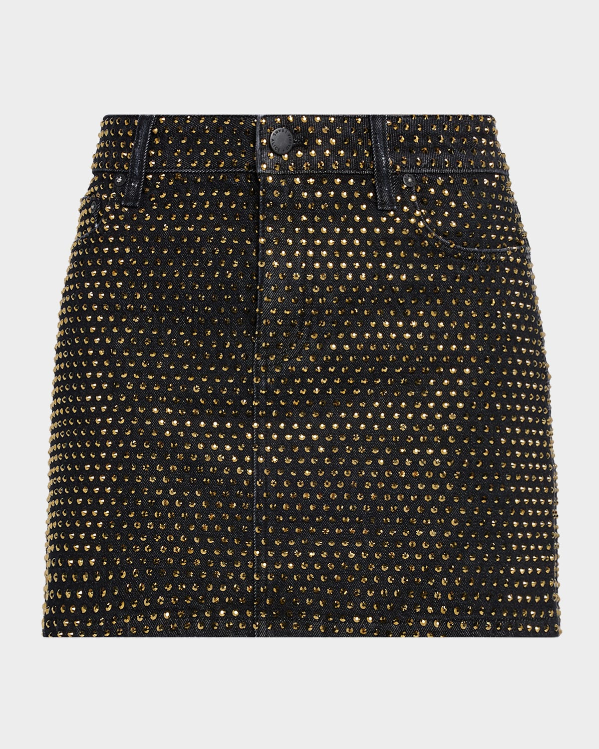 Embellished with shimmering crystals allover, the "Joss" mini skirt by Alice + Olivia adds a touch of glam to your favorite denim mini. Approx. 14.5"L from hip to hem High rise Fivepocket style Skirt falls straight from hip to hem Hem falls above the knee Button/zip fly; belt loops Cotton/elastane Lining: Cotton Dry clean Imported