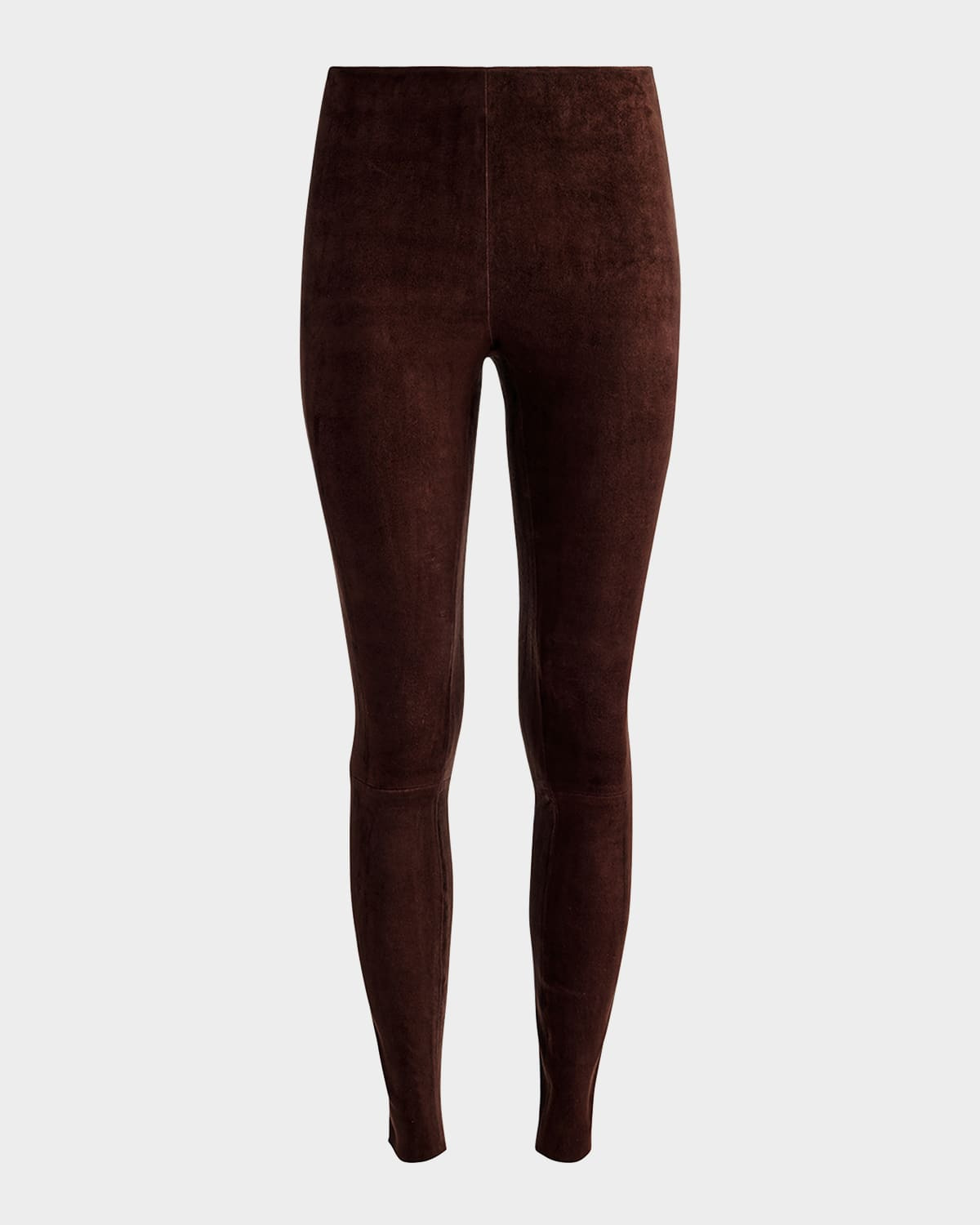 Made from butterysoft lambskin suede, the "Lennox" leggings by Alice + Olivia are ultrafitted for a flattering silhouette Approx. 9.5" rise; 29" inseam Midrise clean waistband Full length Secondskin fit Sleek back zip closure Suede Lining: Recycled polyester Dry clean Imported