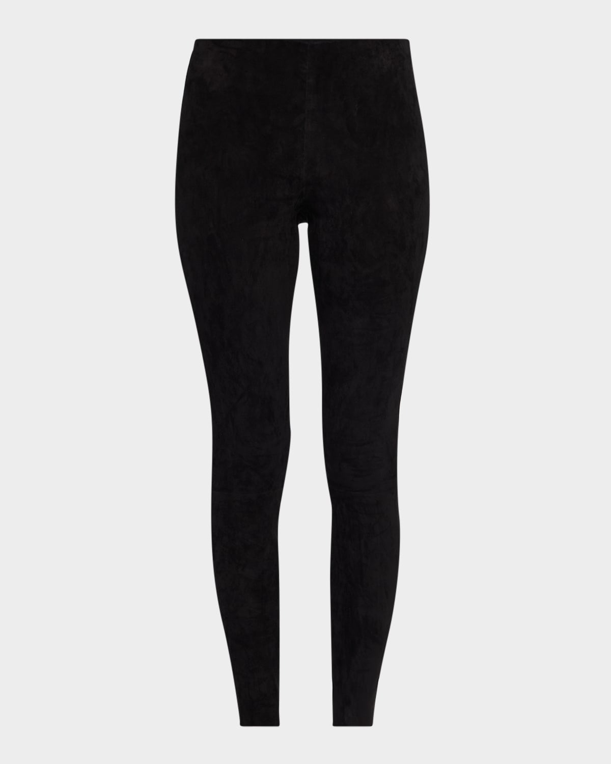 Made from butterysoft lambskin suede, the "Lennox" leggings by Alice + Olivia are ultrafitted for a flattering silhouette Approx. 9.5" rise; 29" inseam Midrise clean waistband Full length Secondskin fit Sleek back zip closure Suede Lining: Recycled polyester Dry clean Imported