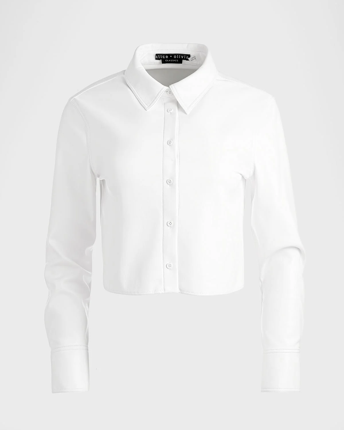 Alice + Olivia "Leon" luscious vegan leather shirt in a classic silhouette & nbsp; Approx. 18"L from shoulder to hem Spread collar; button front & nbsp; Long sleeves; button cuffs Yoked back Cropped hem Relaxed fit & nbsp; Polyurethane/polyester Fully lined Dry clean Imported Model is 5 & apos;10"/177cm.