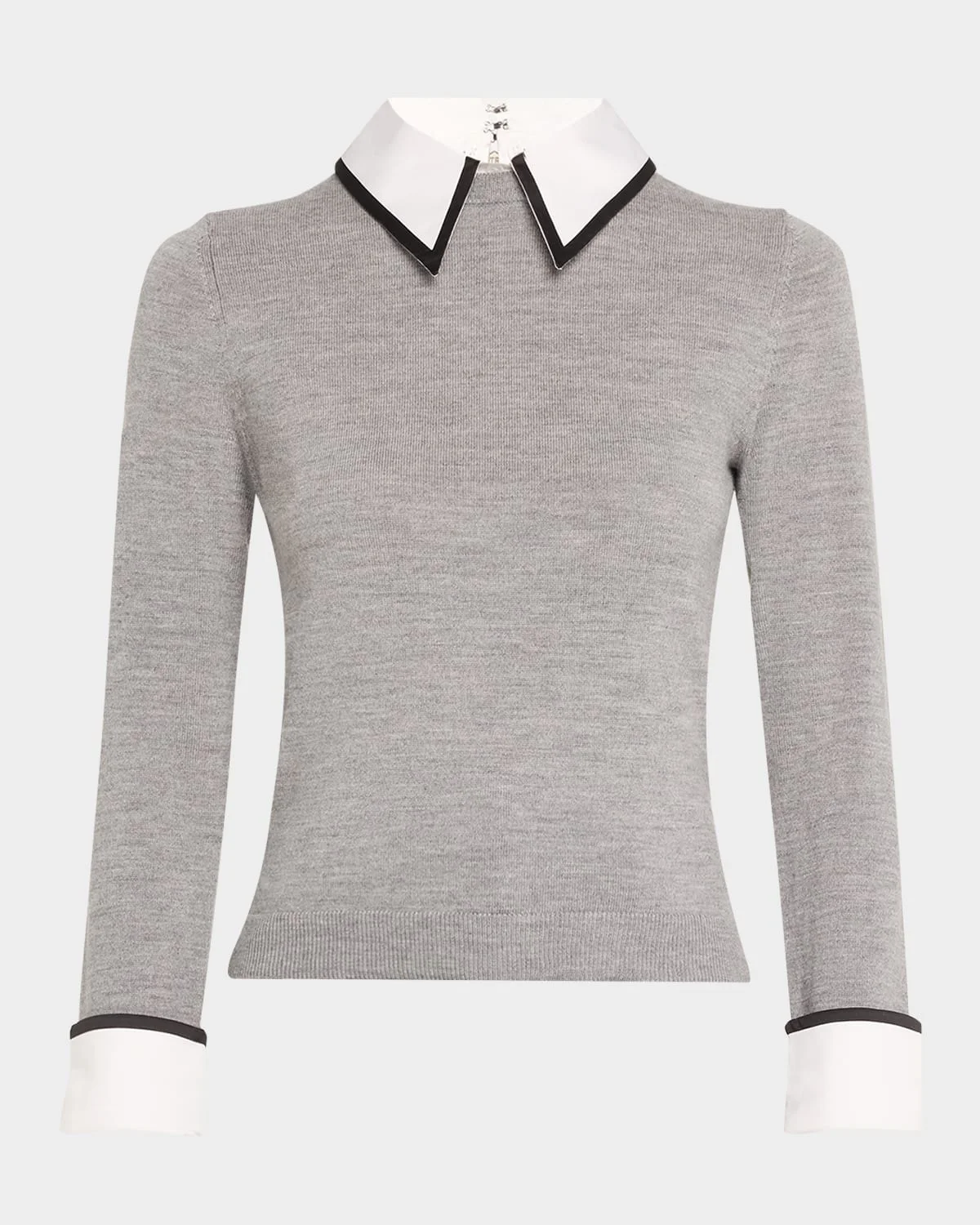 - Alice + Olivia "Porla" sweater adorned with a detachable contrasting collar - Crew neckline - Long sleeves; contrasting cuffs - Hip length - Slim fit - Exposed back zipper - Wool/elastane - Dry clean - Imported - Model is 5'10"/177cm. - Size Note: Item runs small, consider ordering a size up.