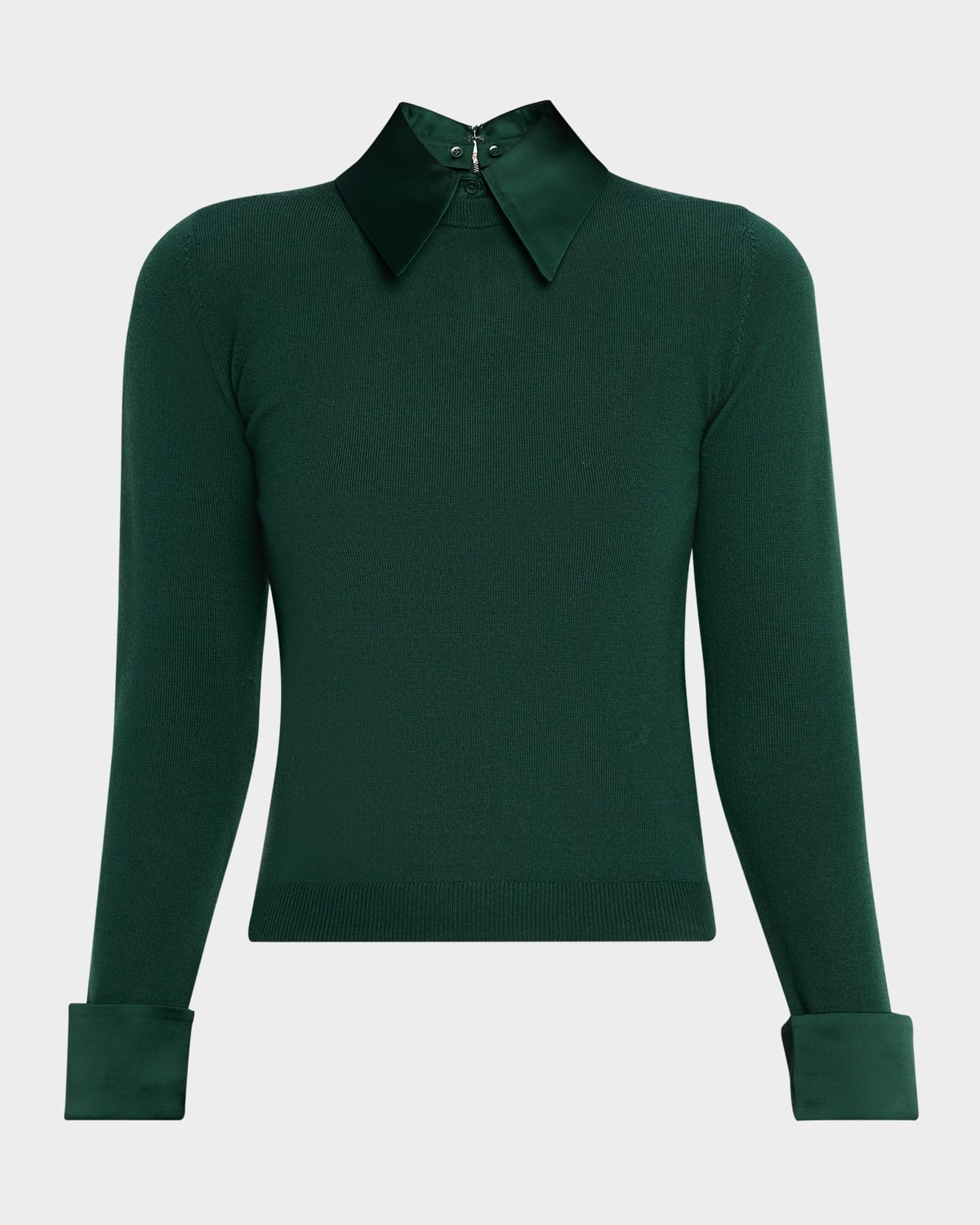 Crafted in a soft ribbed wool blend, the "Porla" sweater by Alice + Olivia features tonal satin trim for a touch of shine and sophistication. Spread collar Long sleeves with button cuffs; approx. 29.5"L Classic fit Hem sits at the hip Exposed back zip Wool/elastane Unlined Dry clean Imported
