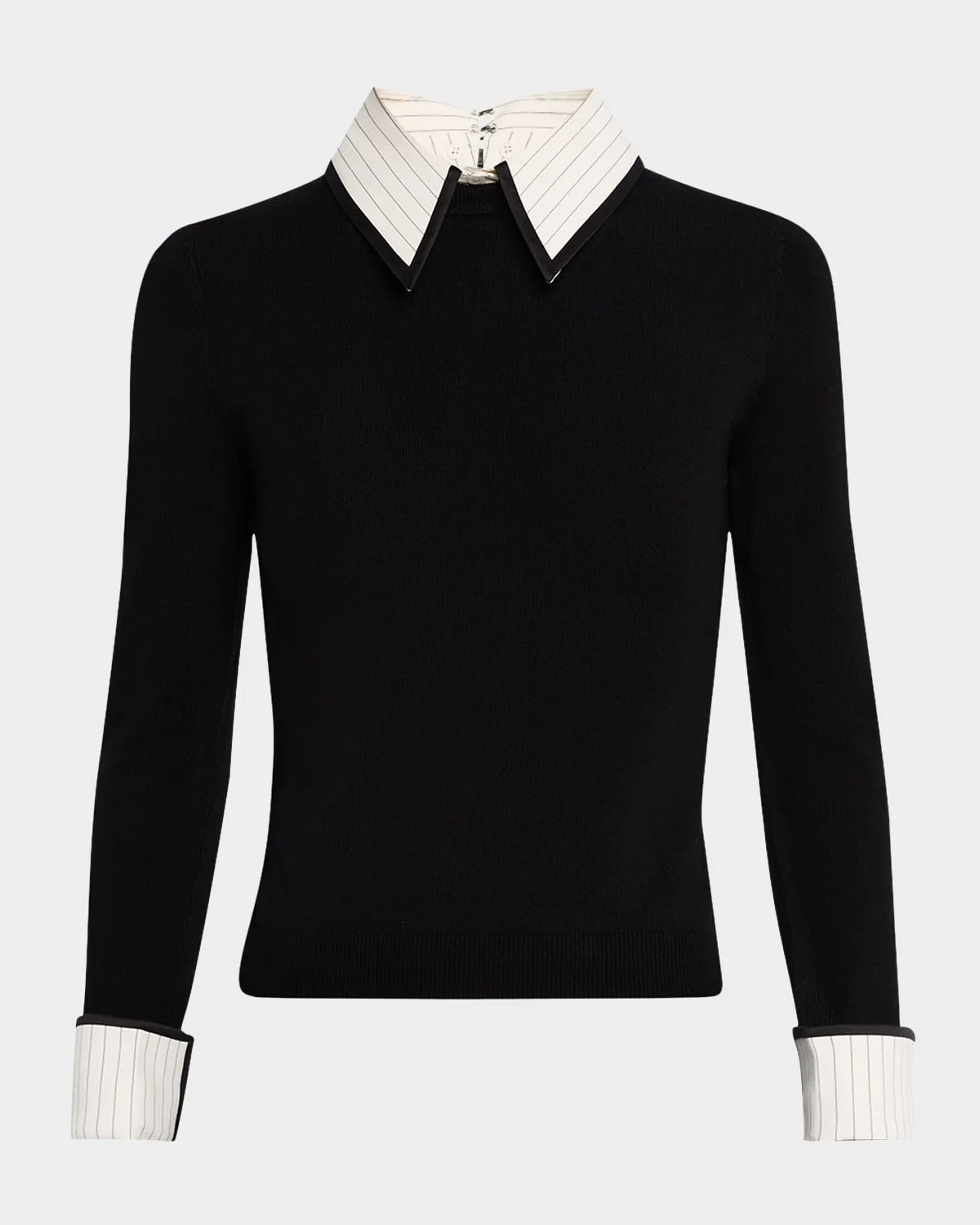 - Alice + Olivia "Porla" sweater adorned with a contrasting pinstripe collar and matching cuffs - Point collar - Long sleeves; rolled cuffs - Hip length - Slim fit - Back zip closure - Pullover style - Wool/elastane - Dry clean - Imported - Model is 5'10"/177cm. - Size Note: Item runs small, consider ordering a size up.
