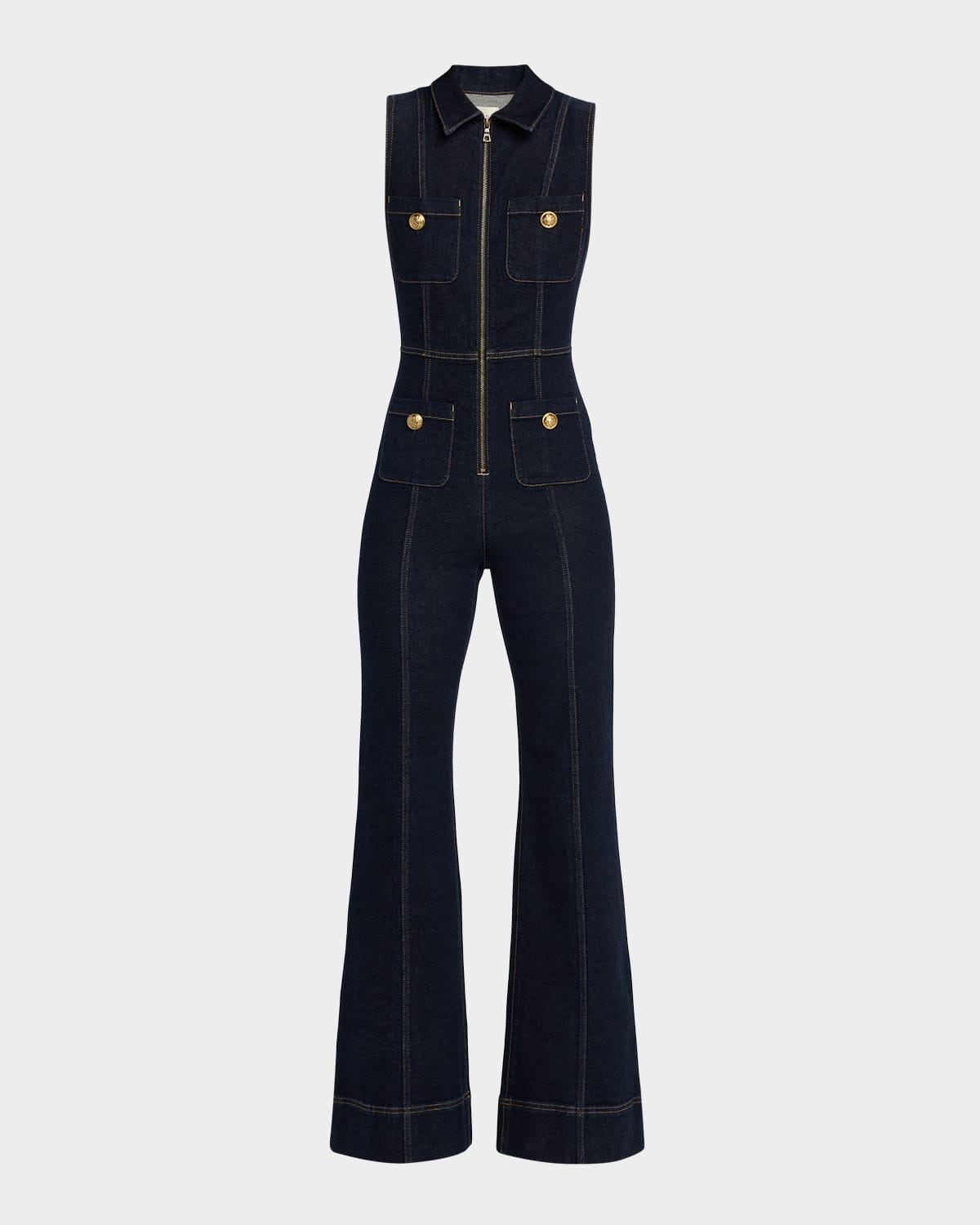 Stepinto your new favorite denim, the "Rachel" jumpsuit by Alice + Olivia offers a utilityinspired silhouette with goldtone hardware for a polished finish. Spread collar Sleeveless Dual chest and hip pockets Slim fit Bootcut legs Full length Exposed zipfront; stepin style Cotton/elastane Lining: Polyester Dry clean Imported