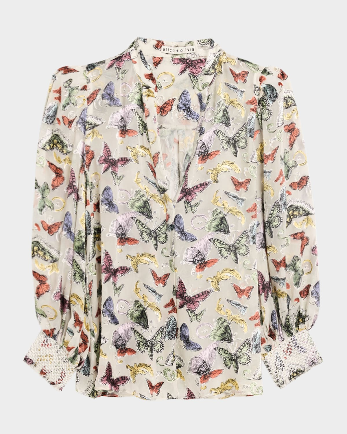 Cut from an airy silk blend, the "Sheila" blouse by Alice + Olivia features a vibrant butterfly print with a hidden buttonfront for a effortless look. V neckline Blouson sleeves with smocked cuffs; approx. 30.5"L Classic fit Hem falls to the hip Concealed buttonfront Viscose/silk Lining: Recycled polyester Dry clean Imported