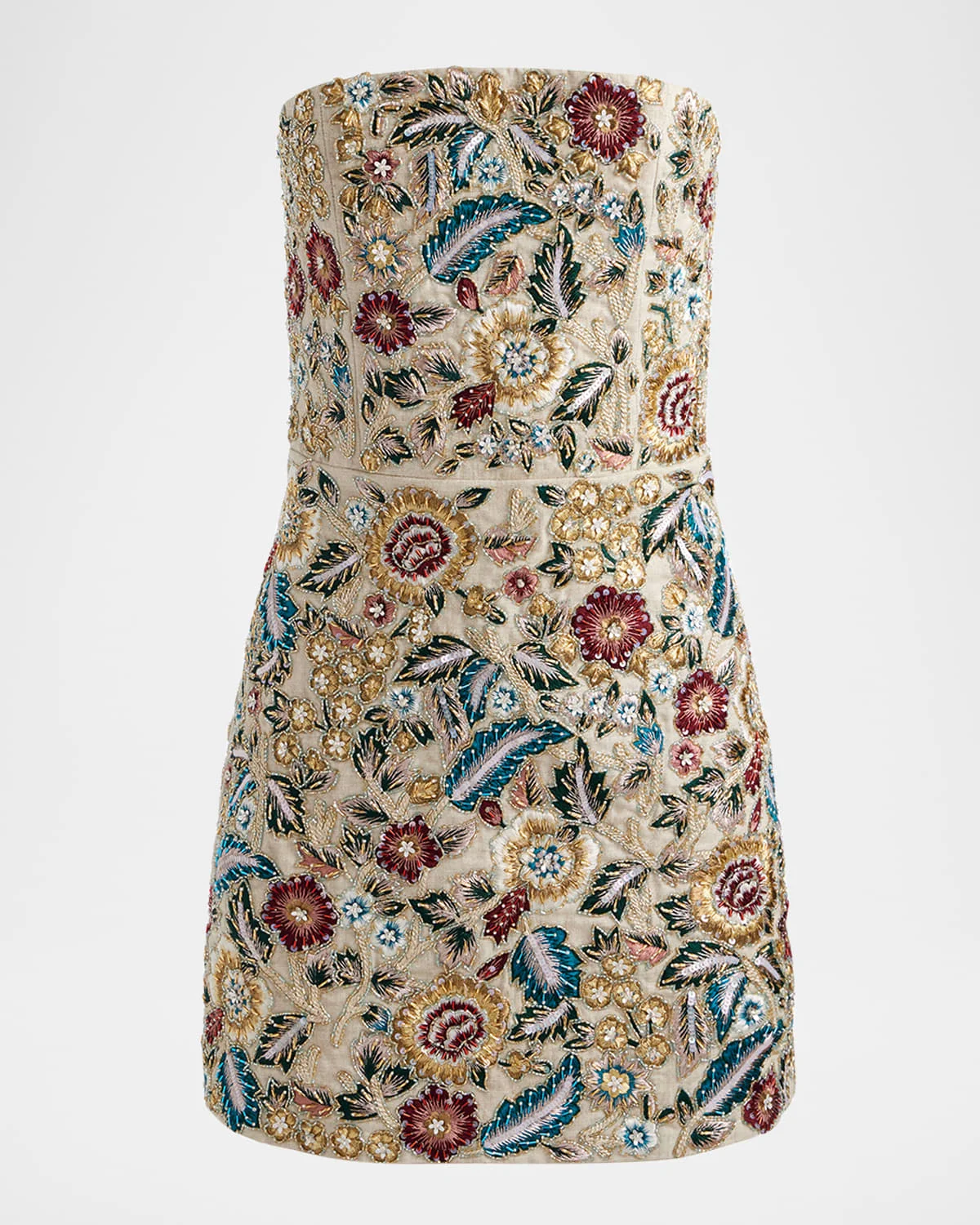 - Alice + Olivia "Velia" abbreviated gown embellished with sequins and beading in a floral design - Approx. 33"L from shoulder to hem - Strapless neckline - Sleeveless - Hem falls above the knee - Center back zipper - Linen - Dry clean - Imported