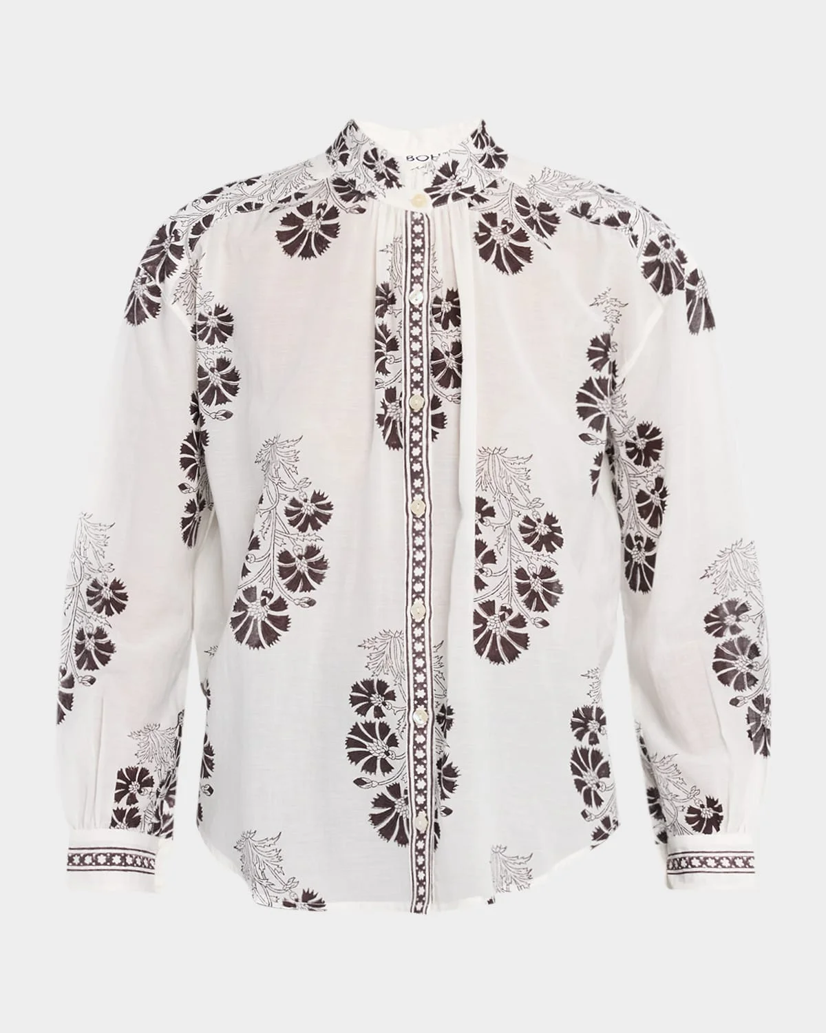Crafted in airy cotton voile, the "Kiki" blouse by Alix of Bohemia is adorned with an abstract floral print Stand collar Long sleeves with button cuffs Classic fit Hem falls to the hip Buttonfront Cotton/silk Unlined Dry clean Imported