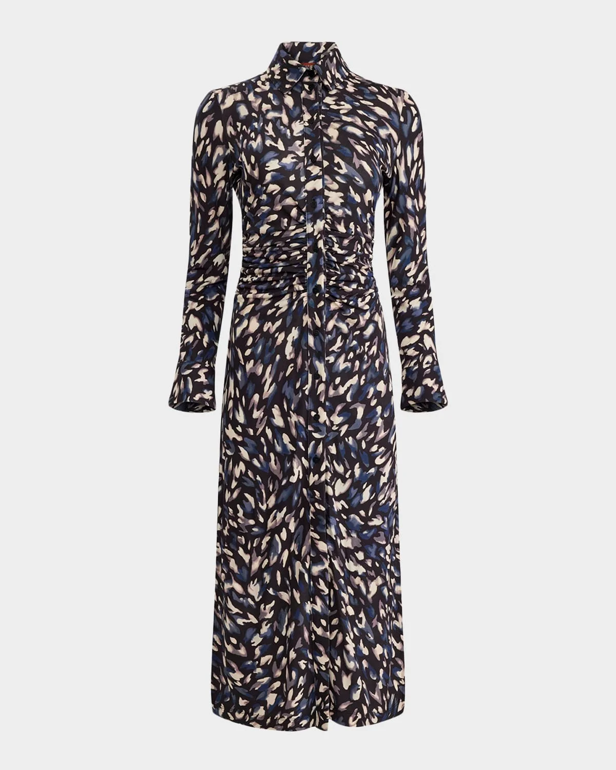 Altuzarra's "Claudia" shirtdress is designed in an abstract animal pattern with flattering ruching at the waist Point collar; button front Long sleeves; button cuffs Thighhigh side slits Full length Straight silhouette Viscose Dry clean Made in Portugal