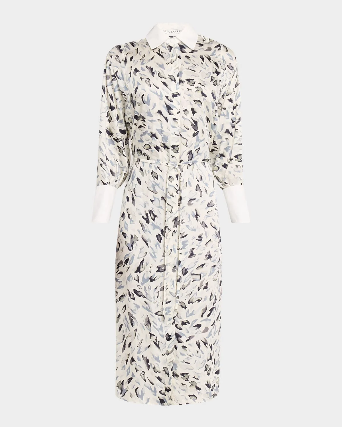 Altuzarra "Floyd" animal-print midi dress designed with an elevated, shirtdress silhouette with contrast trim. Point collar Long sleeves with button cuffs Self-tie belt Hem falls below the knee Hidden button-front & nbsp; Polyester Dry clean Made in Italy