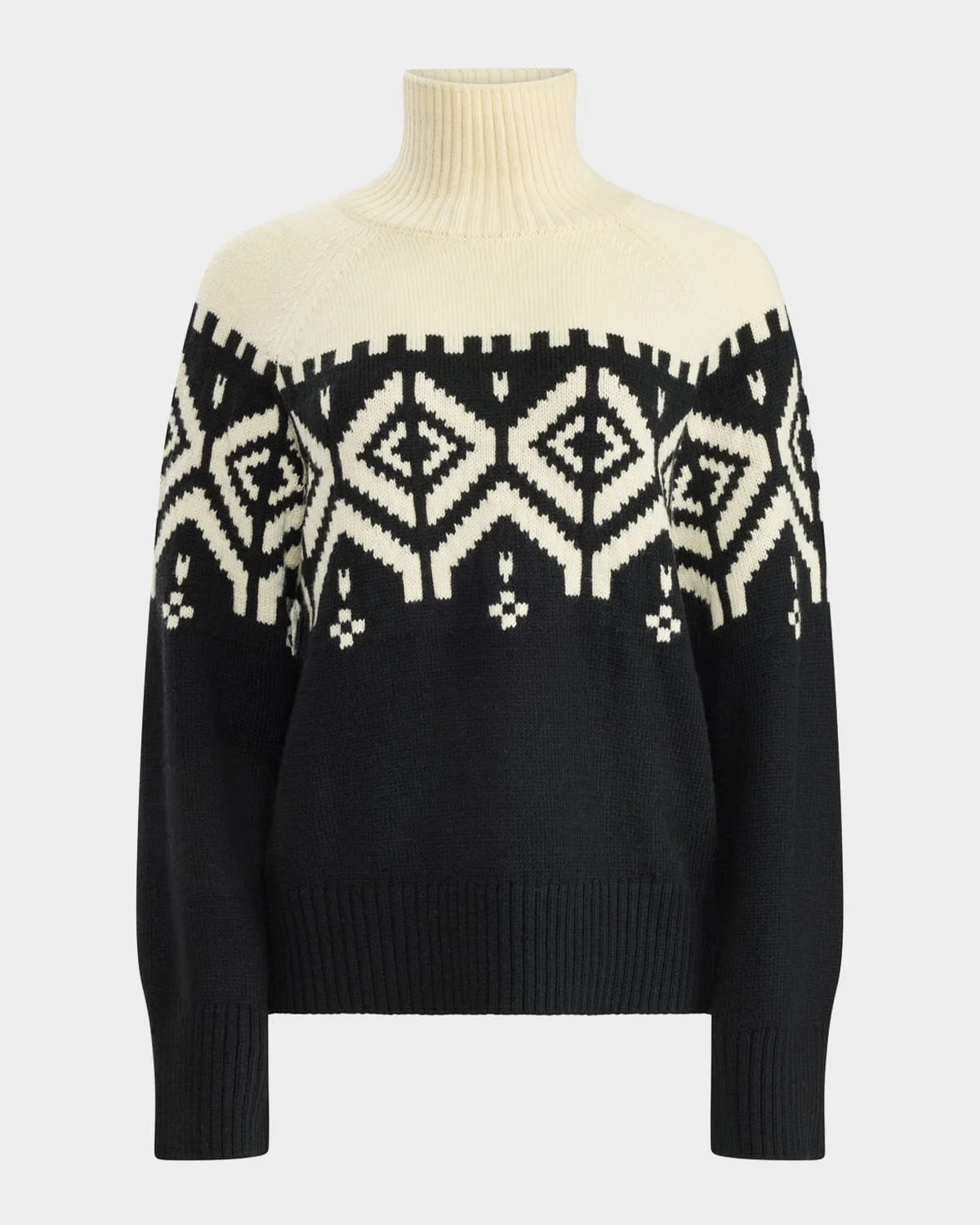 Designed with an abstract Fair Isle motif, the "Hamilton" sweater by & nbsp;ALTU is knitted from luxurious merino wool and boasts a two-tone silhouette that exudes cozy sophistication. Turtleneck & nbsp; Long raglan sleeves Classic fit Hem falls to the hip Pullover style & nbsp; Merino wool Dry clean Imported SIZE & FITModel measurements: 5 & apos;10" tallModel is wearing a US size 4/Small