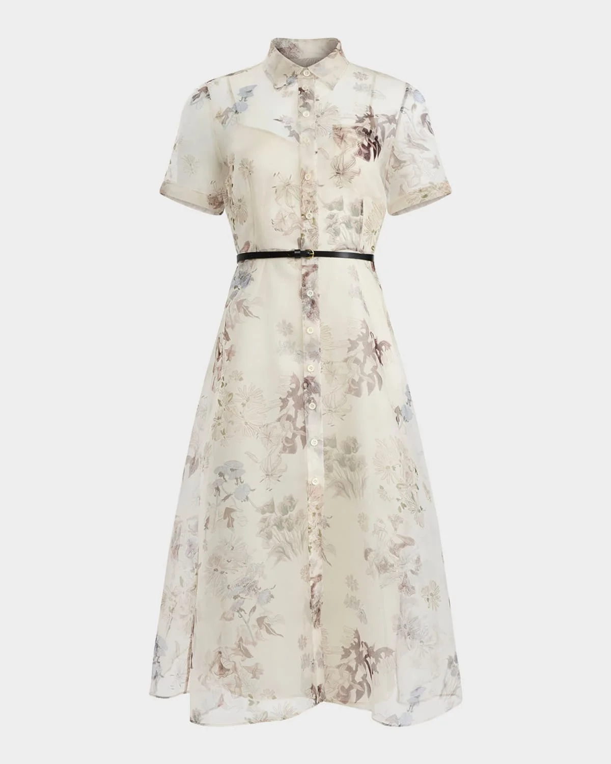 The "Kiera" floralprinted dress by Altuzarra features an airy silhouette with a slim leather waist belt Shirt collar; button front Short sleeves Yoked back Hem falls below the knee Aline silhouette Silk Dry clean Made in Italy