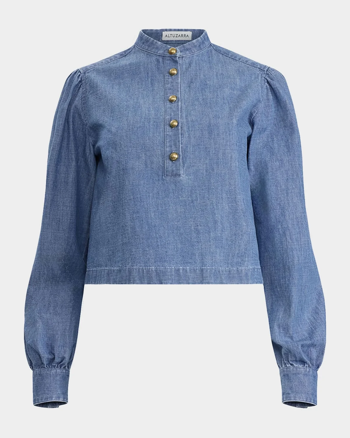 The "Margot" top by ALTU is cut from crisp Italian cotton and finished with hammered golden buttons for a sophisticated touch. Stand collar; button-placket Long sleeves with button cuffs Classic fit Hem sits at the hip Pullover style & nbsp; Cotton & nbsp; Dry clean Made in Italy SIZE & FITModel measurements: 5 & apos;10" tallModel is wearing a US size 4/Small