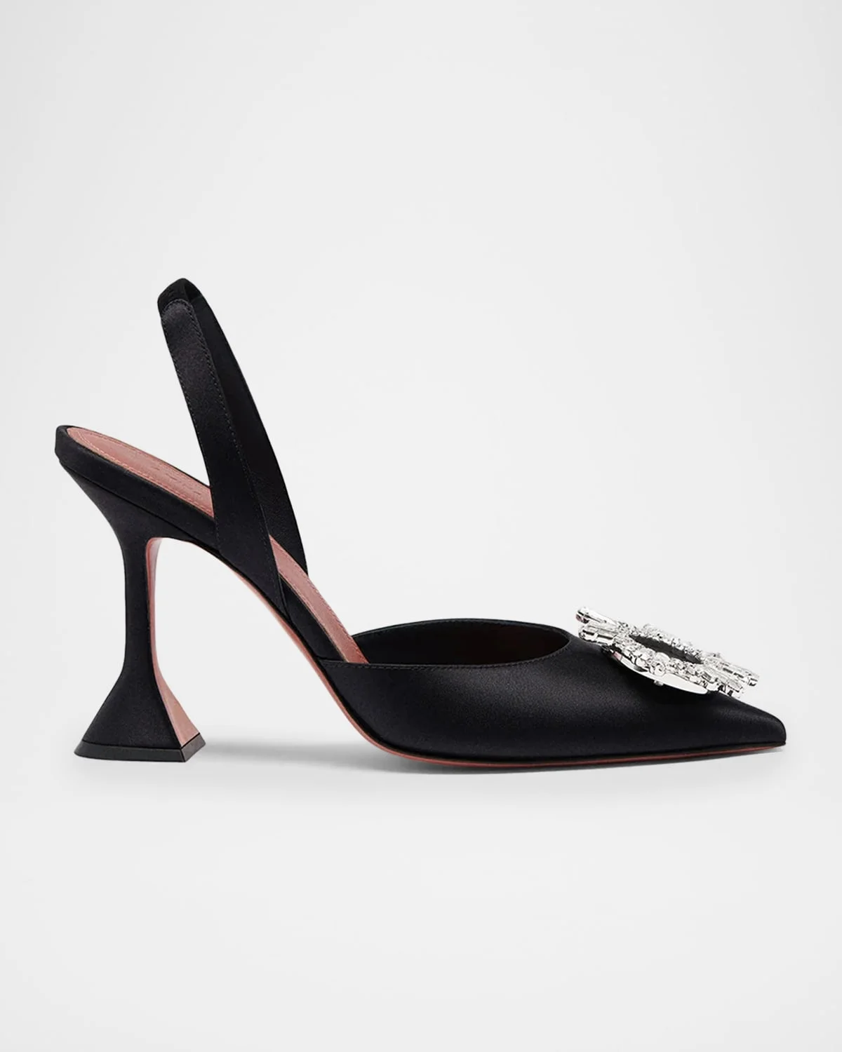 Adorned with the signature starburst embellished brooch, these "Begum" pumps by Amina Muaddi are made from lustrous satin 3.75 in / 95 mm exaggerated pedestal stiletto heel Pointed toe Halter slingback strap Silk upper Leather lining and outsole Made in Italy