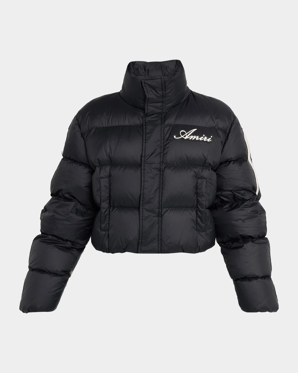 Amiri Bones puffer jacket is crafted from a technical nylon accented with a logo patch on the chest and signature bone patches along the sleeves Stand collar; concealed zip front Long sleeves Hip welt pockets Slim fit Cropped length Nylon/polyamide Fill: Down Made in Romania