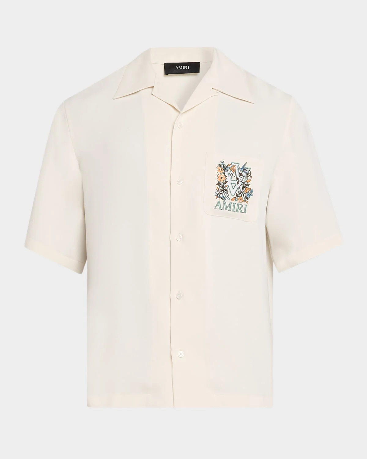 Amiri & apos;s "Sparrow Pocket" camp shirt is illustrated with bird & nbsp;and botanical motif embroidery on the chest pocket. From the Spring-Summer 2026 collection Notch collar Button front Breast pocket Relaxed fit Polyester Made in Italy