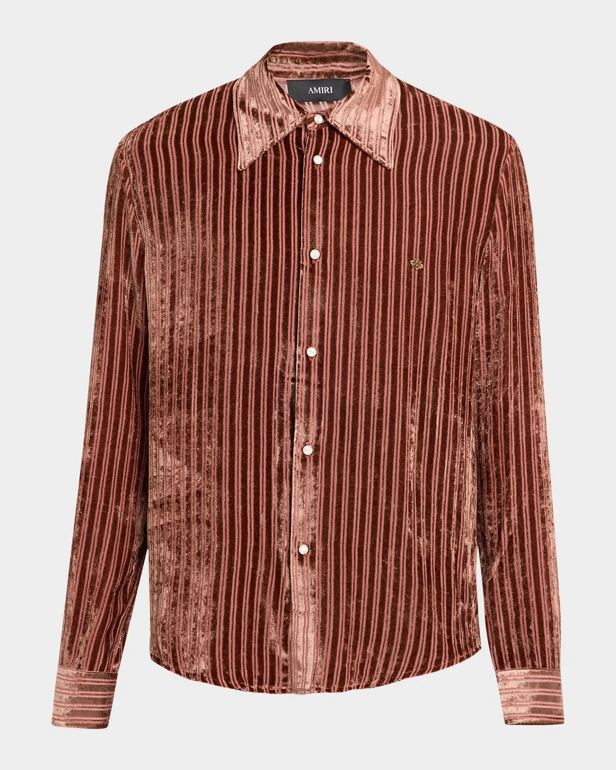 This Amiri stripe dress shirt is crafted from velvet, resulting in a luxurious sheen and texture. Point collar Snap placket Small MA ornament on the chest Snap cuffs Curved hem Wool/silk Made in Italy