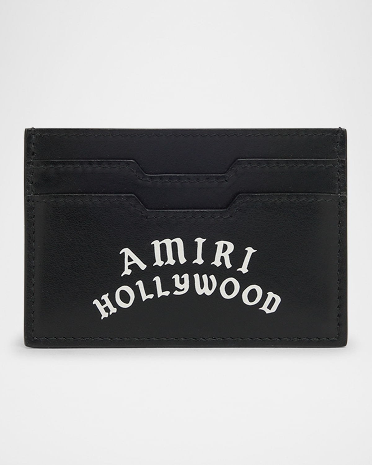- Amiri card holder in leather highlighted by contrast Amiri Hollywood text with an edgy font - Logo on the back - One central compartment - Four card slots - Approx. 2.9"H x 4.1"W x 0.3"D - Made in Italy