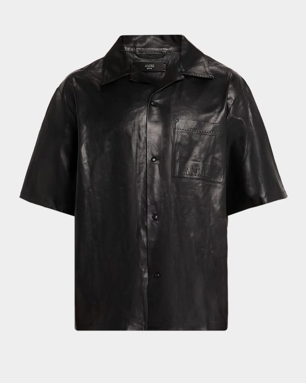 The Amiri camp shirt is elevated through lightweight leather fabrication and monochrome logo embossing on the chest pocket Notched collar Button front Short sleeves Leather Dry clean Imported