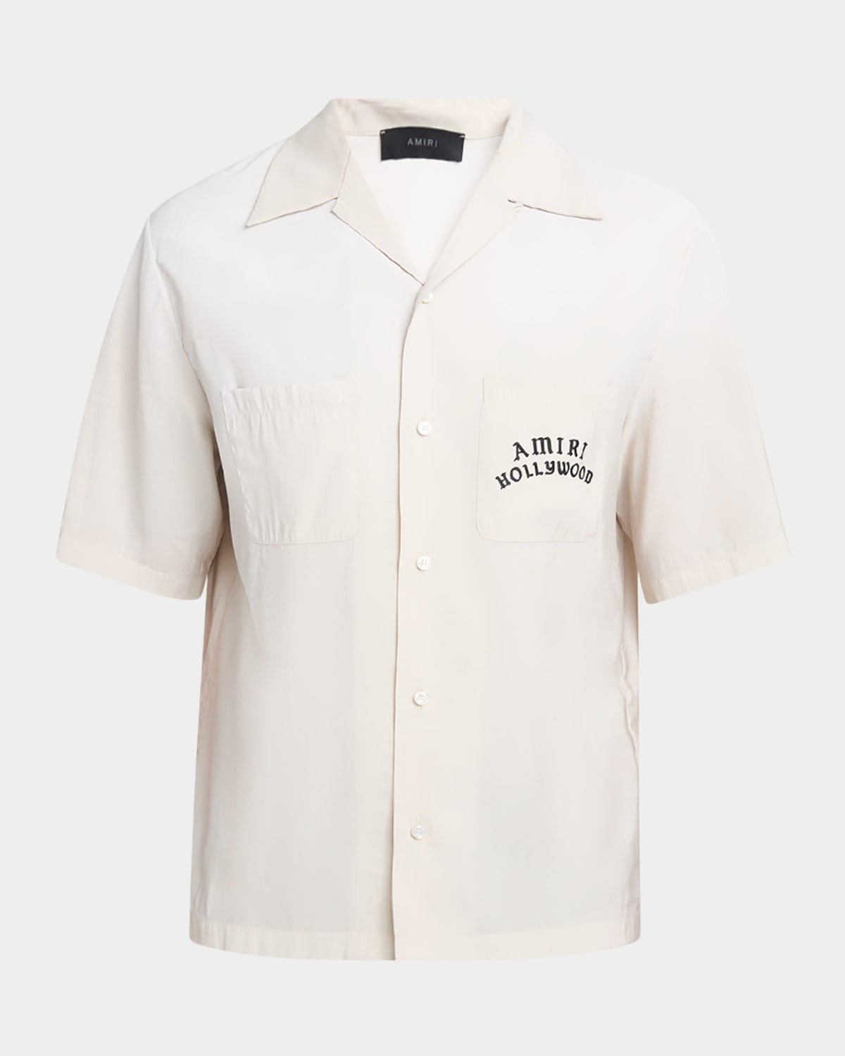 - Amiri faded bowling shirt featuring front and back logo text - Notched collar; button-placket - Short sleeves - Dual chest pockets - Relaxed fit - Modal/polyester - Dry clean - Made in Italy