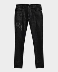 - Amiri jeans in waxed stretch denim - Regular rise - Five-pocket style - Tonal leather logo lettering - Fitted through skinny legs - Button/zip closure; belt loops - Cotton/polyester/elastane - Dry clean - Made in USA